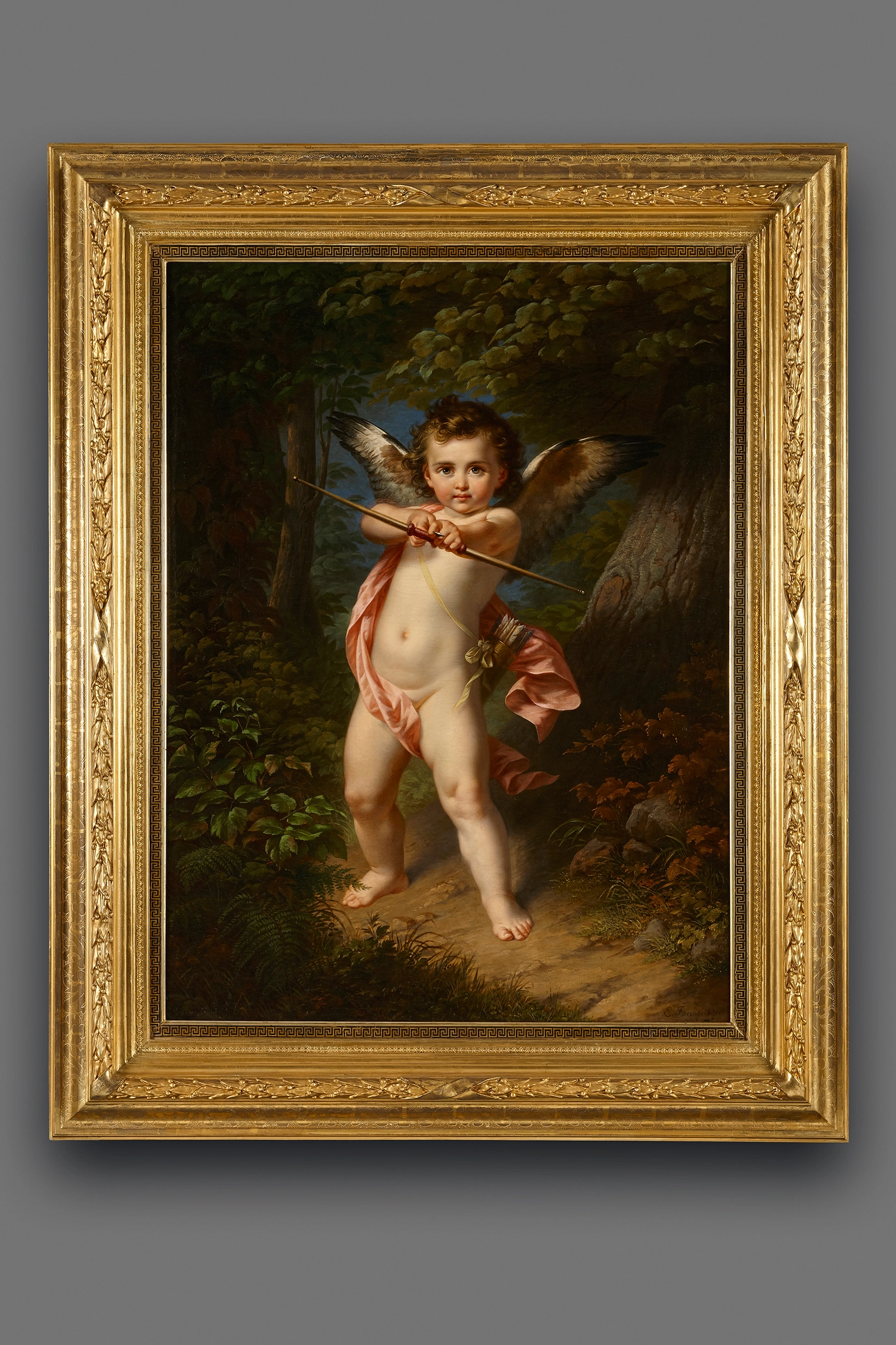 Een jonge Cupido richt zijn pijlen op ons. De bijna naakte god van de liefde staat in het bos, met zijn vleugels uitgeslagen en zijn blik indringend op de toeschouwer gericht.