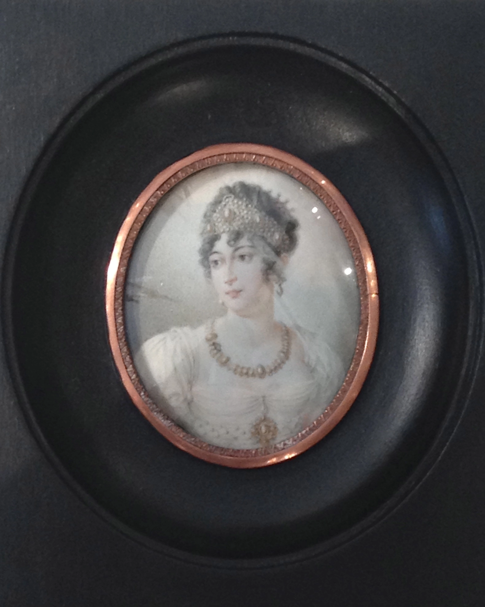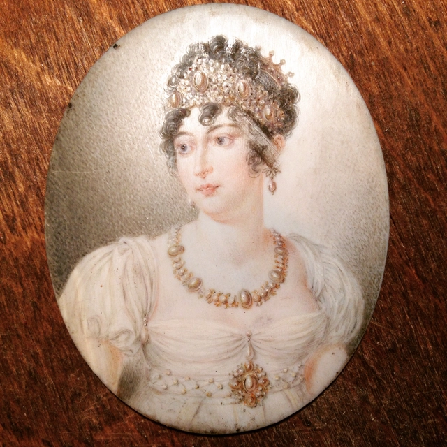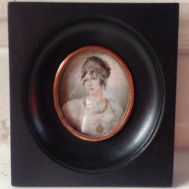 J. Hari: miniatuurportret van jonge vrouw in Empire japon