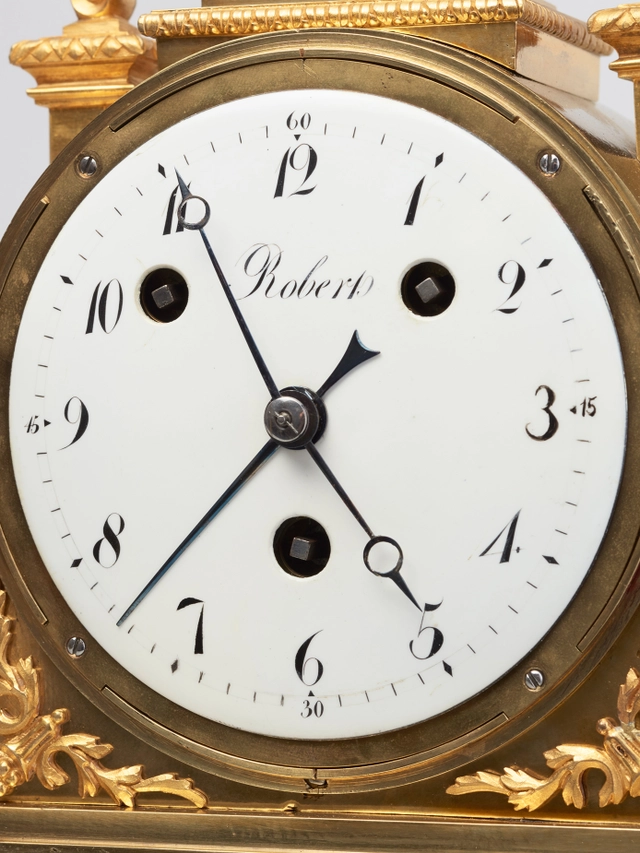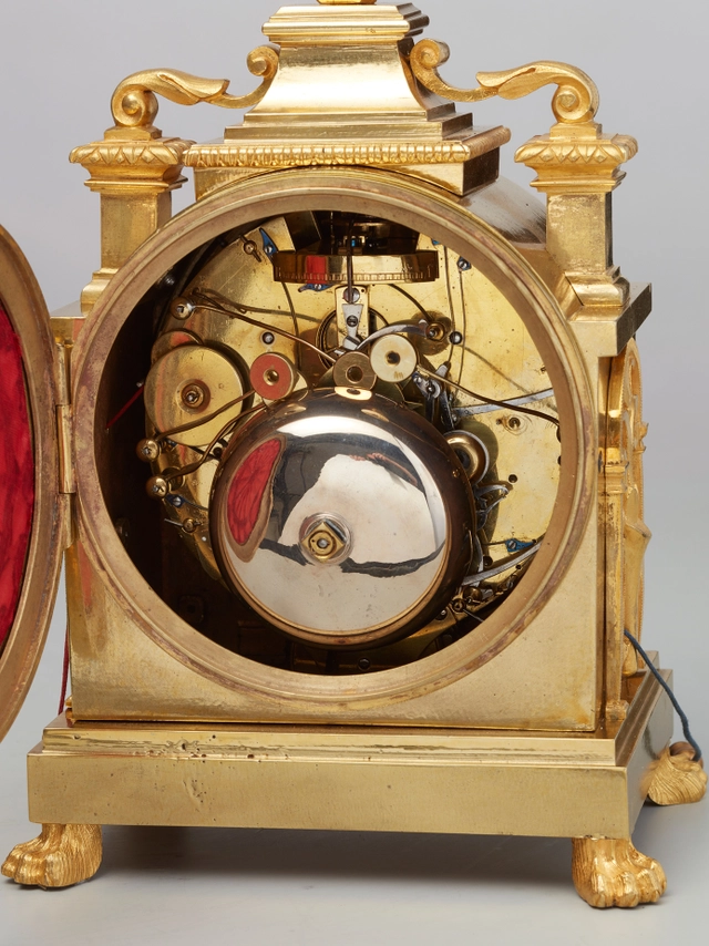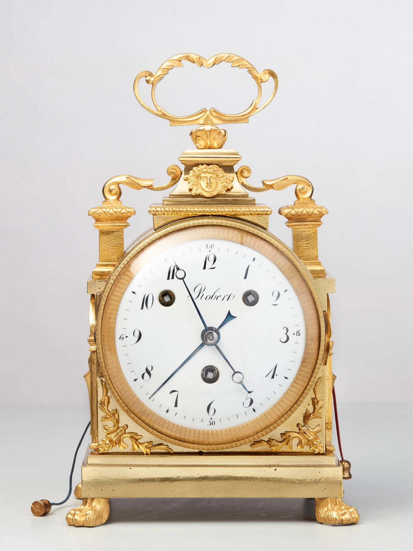 Een Franse verguld messing reisklok met kwartierrepetitie en wekker circa 1880