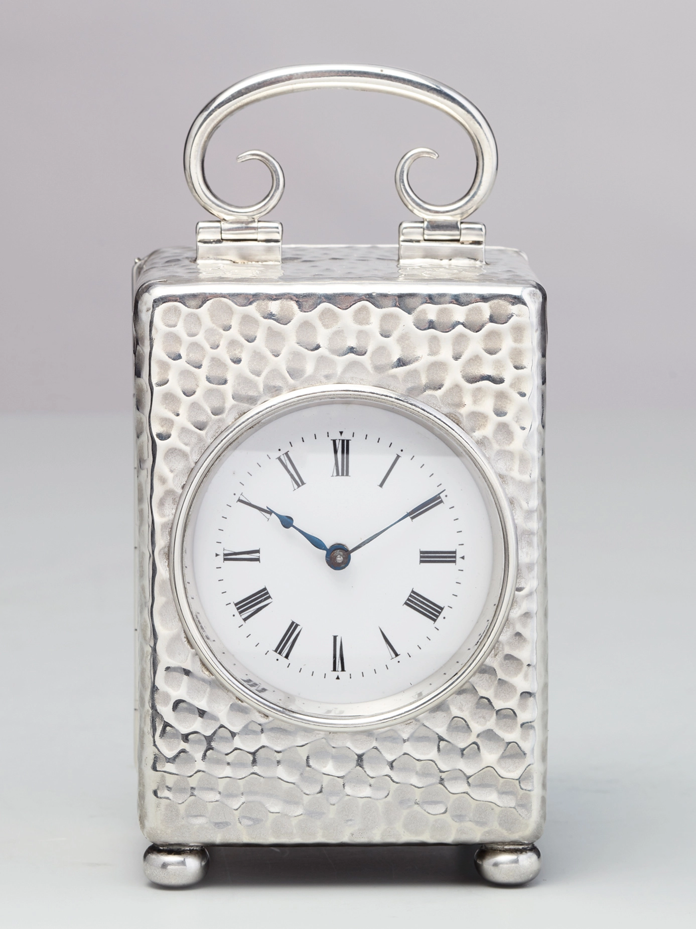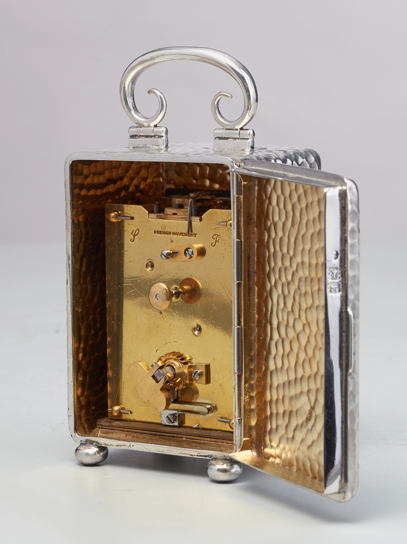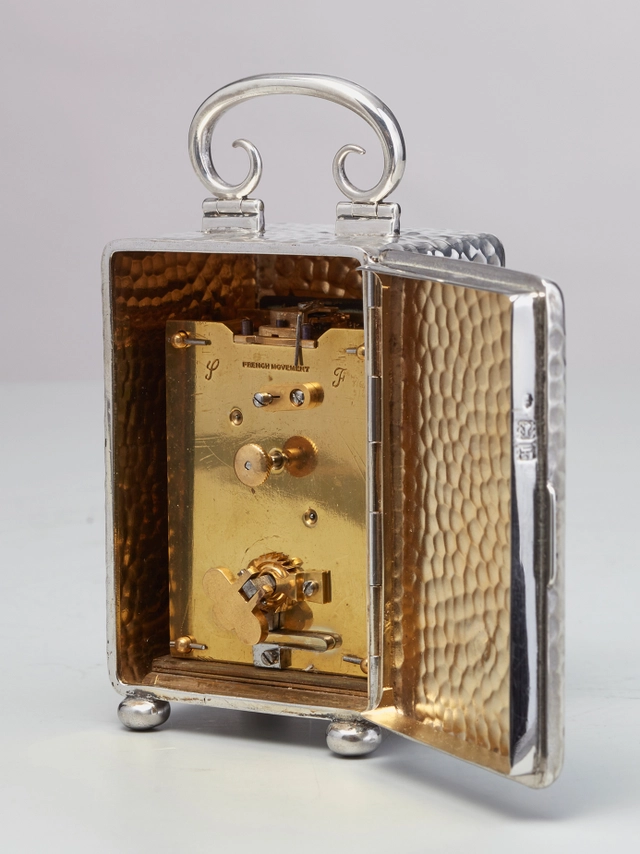 Een fraai Frans miniatuur reisklokje met vernikkelde kast, circa 1925.