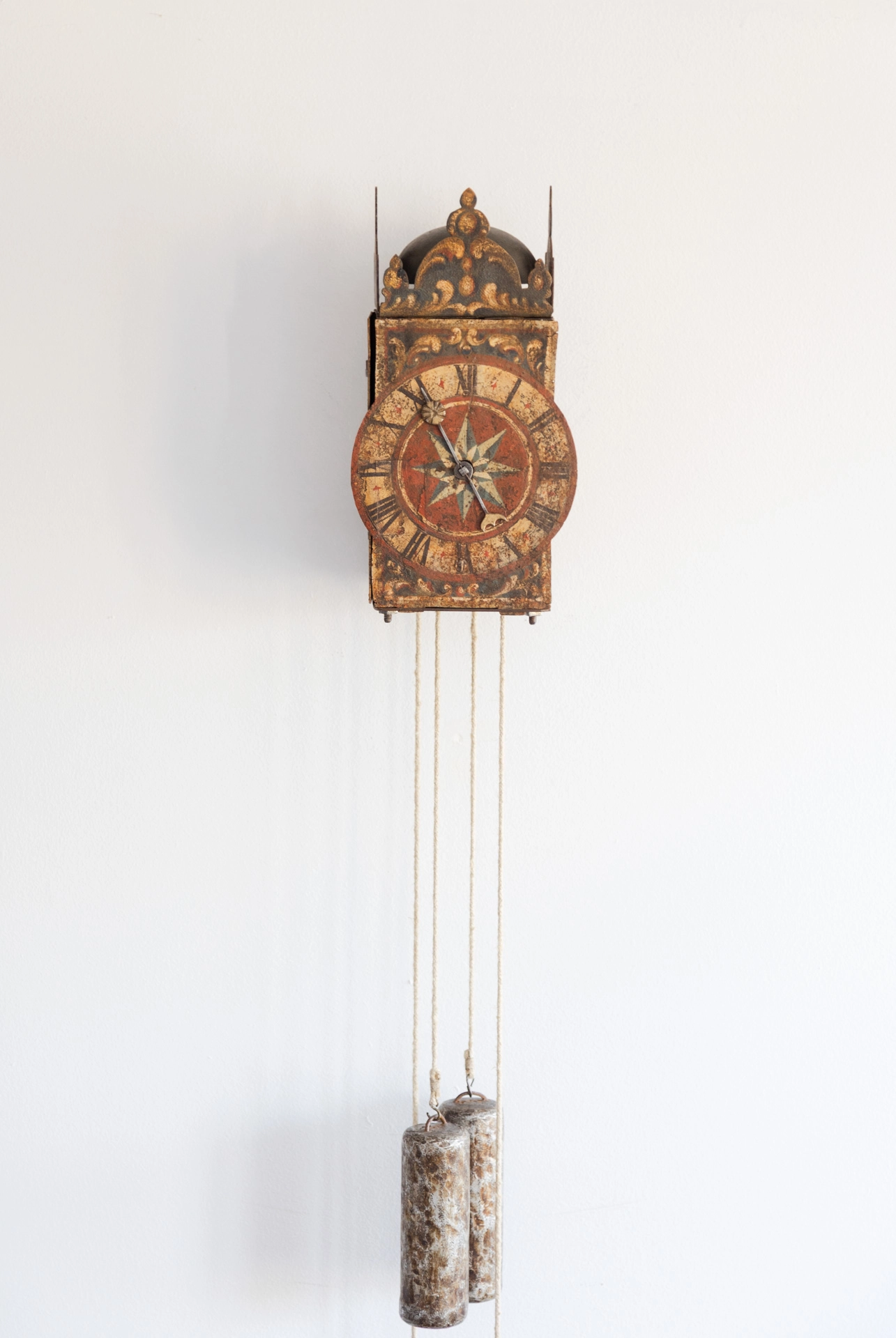 Een vroege Zuid Duitse polychrome wandklok met mechaniek, circa 1590.
