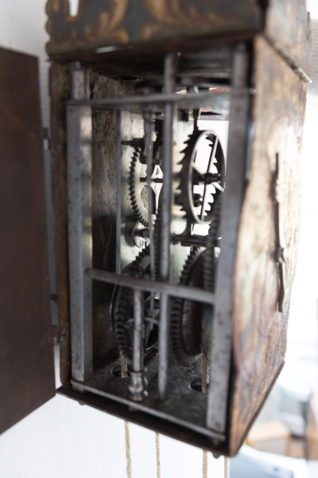 Een Zwitserse messing en ijzeren 'Kuhschwanz' wandklok, circa 1720