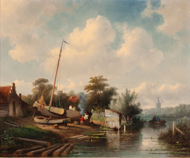 LOUIS JOHAN HENDRIK MEIJER (1809-1866) – SHIPS OFF THE COAST WITH FLAT BOTTOM WITH LOWERED SAILS ON THE LEFT (1858)