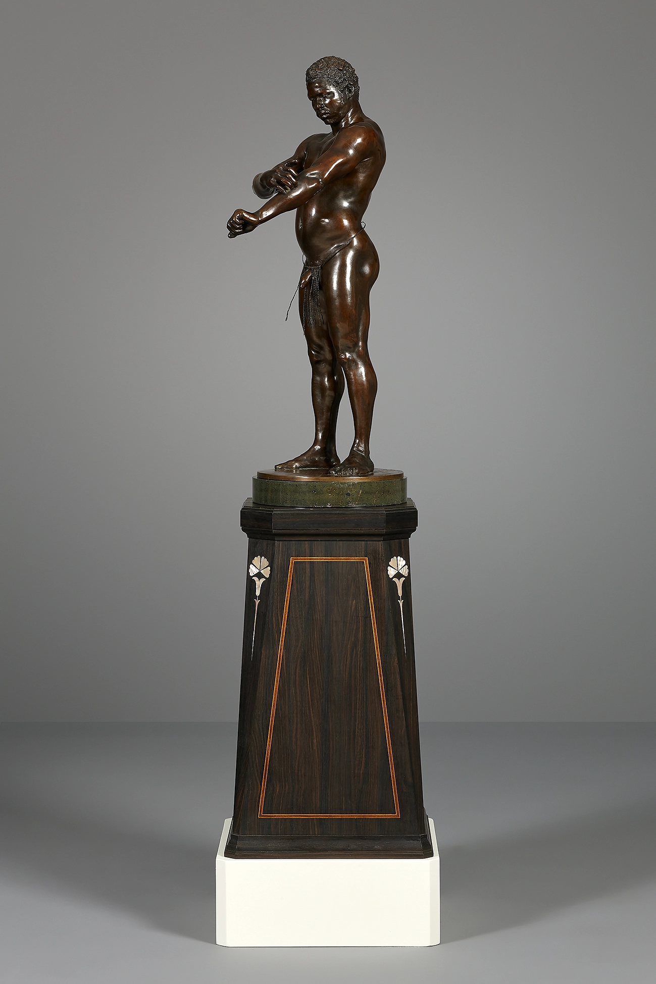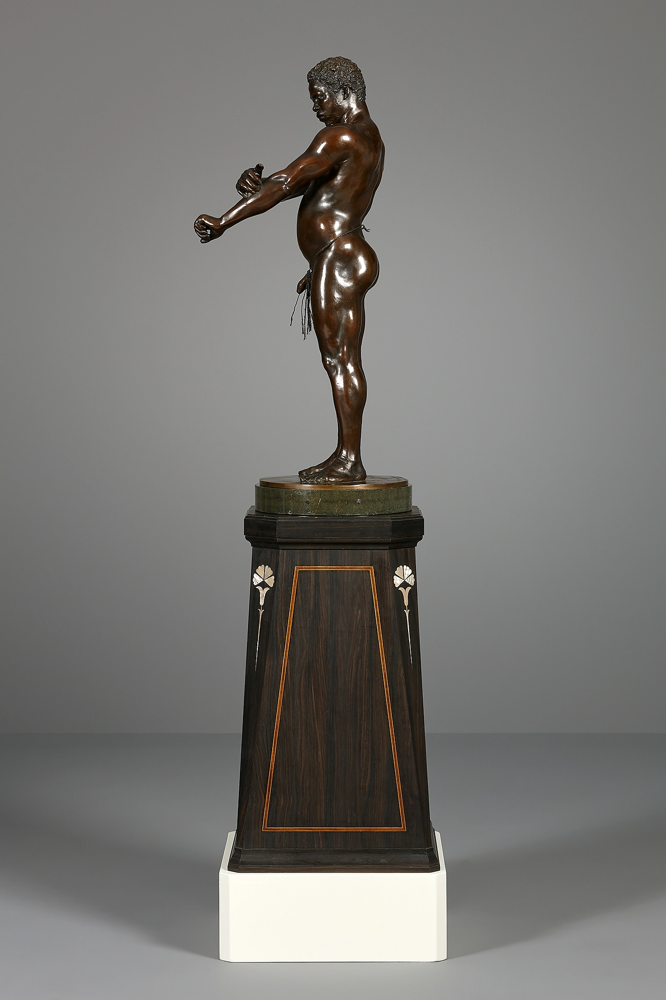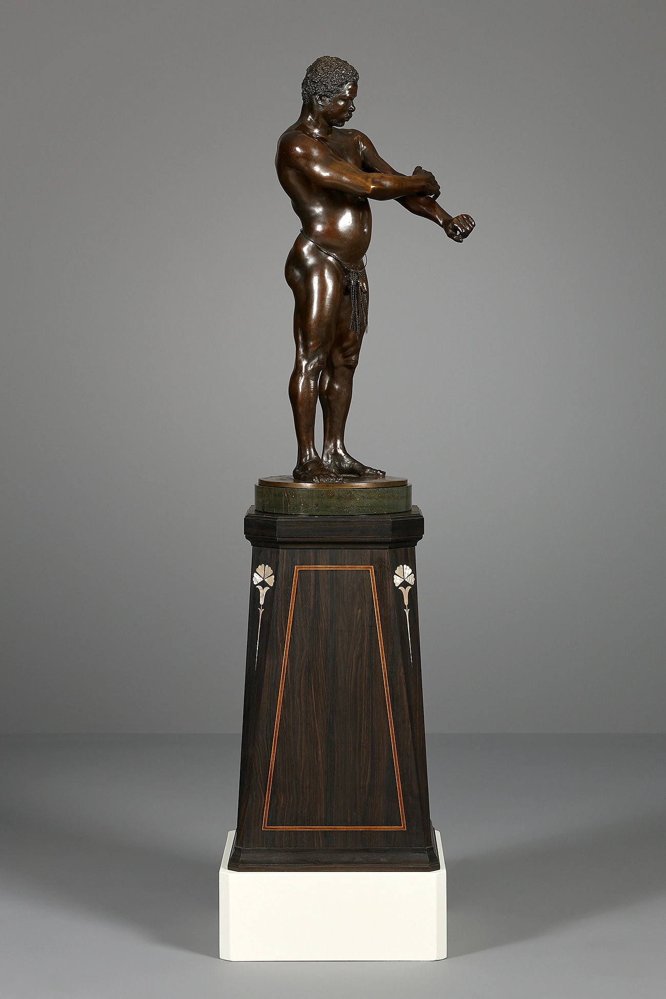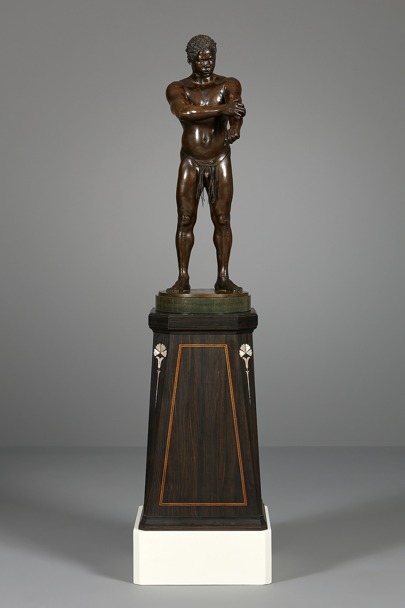 Het beeld op serpentijnstenen voet, is geplaats op een hoge rechte ebbenhouten sokkel met overhoeks geplaatste hoeken, welke ingelegd is met een art nouveau motief in parelmoer.