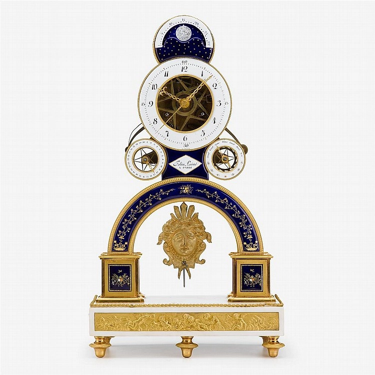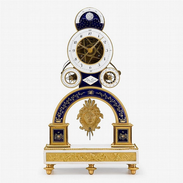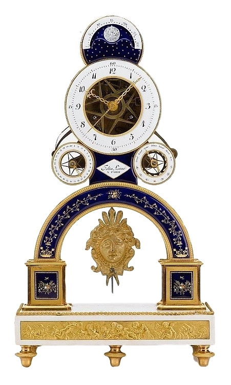 Een Franse Directoire vuurvergulde skeletpendule met email en kalender, Gaston Joly, circa 1795.