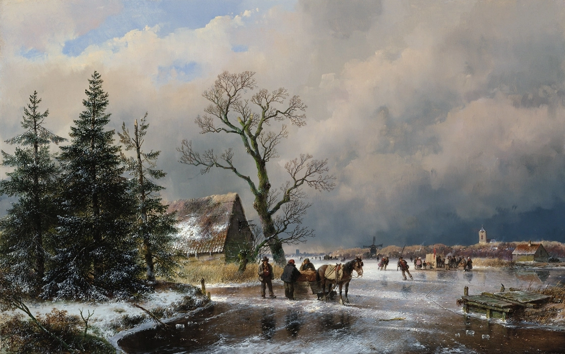 Dutch winterlanschap with three windmills and a koek-and-zopie