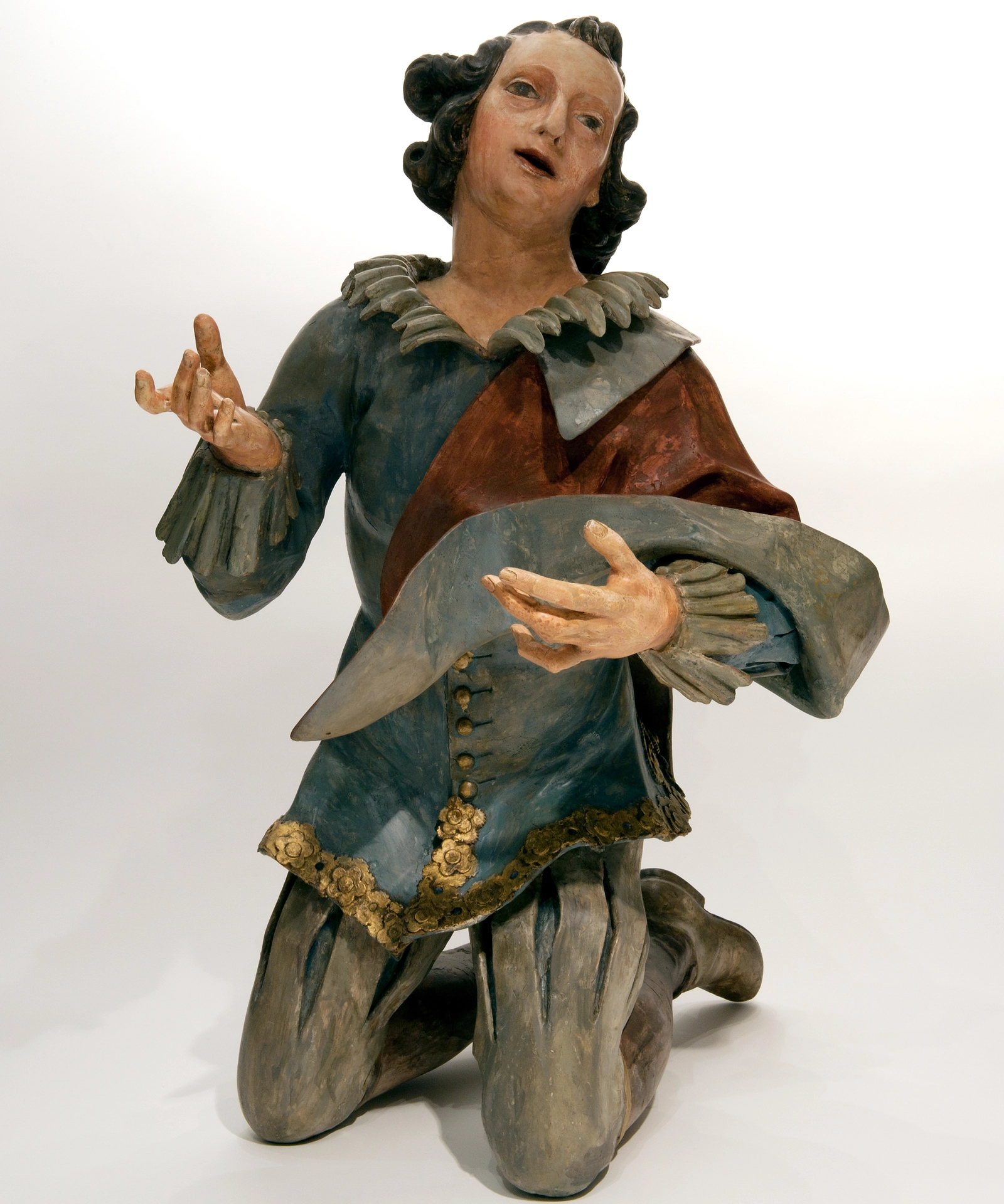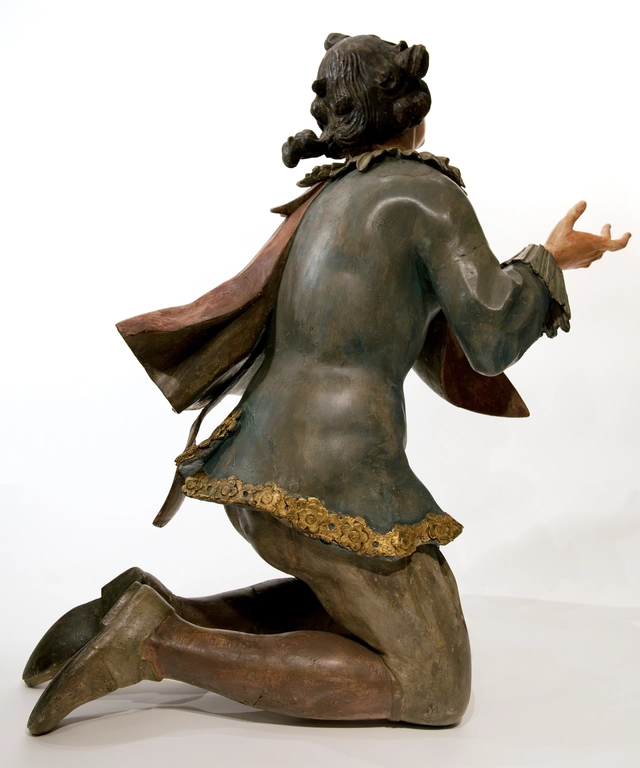Blootshoofd en gekleed in een jas met uitvoerige kraag en manchetten, kniebroek en platte schoenen is hij te identificeren als een jongeman van het gewone volk. De donkere lange krullen, achteraan vastgebonden omlijsten zijn gezicht.