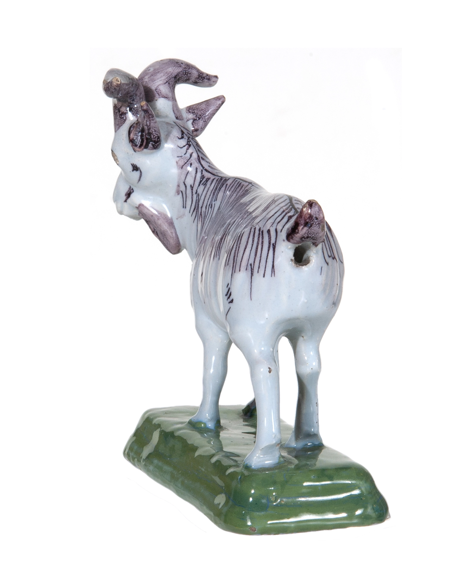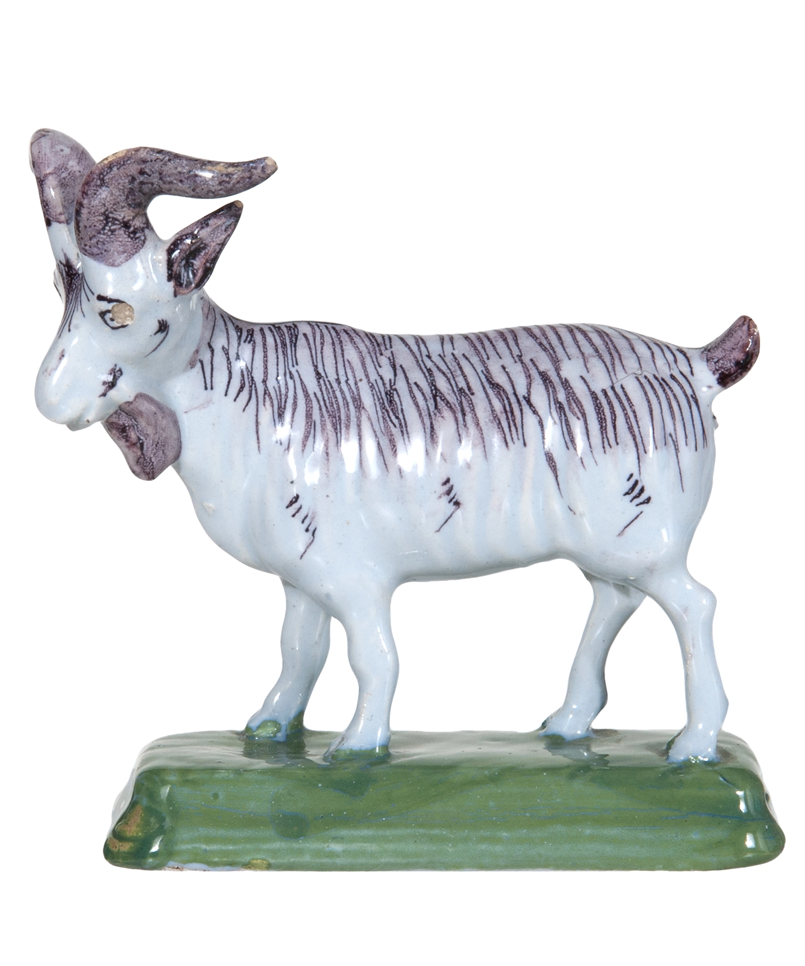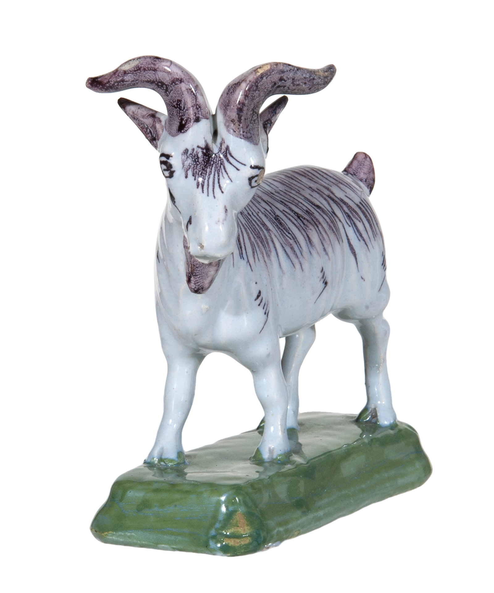 Met een mangaan gelijnde vacht, hoorns, oren en gemodelleerd staand op de groene met gras begroeide top van een hoog uitwaaierende rechthoekige basis