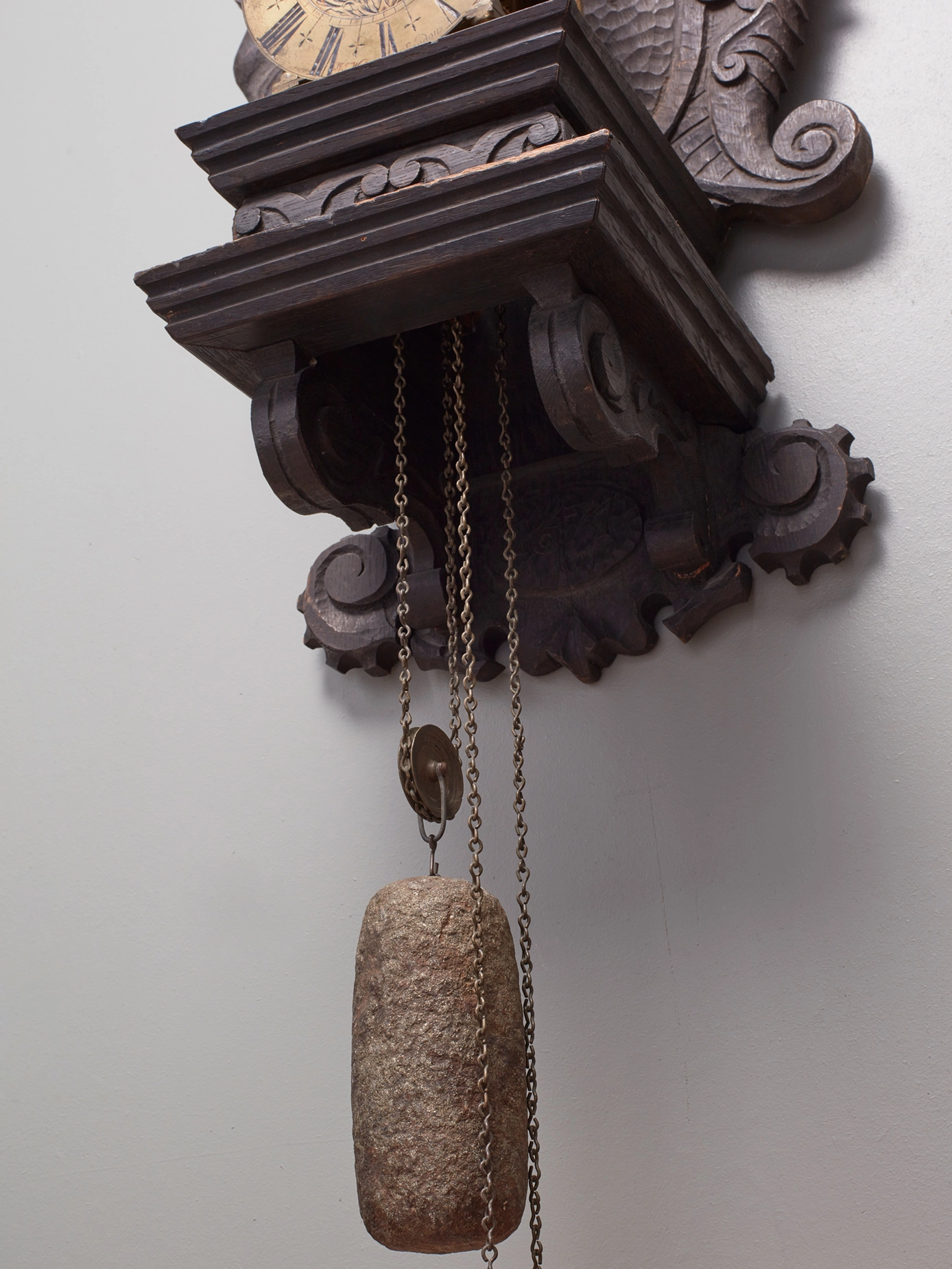 Een vroege Hollandse notenhouten staande klok met snijwerk, door Huijgens, omstreeks 1690