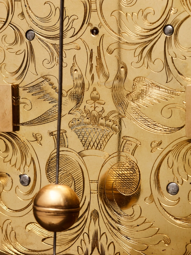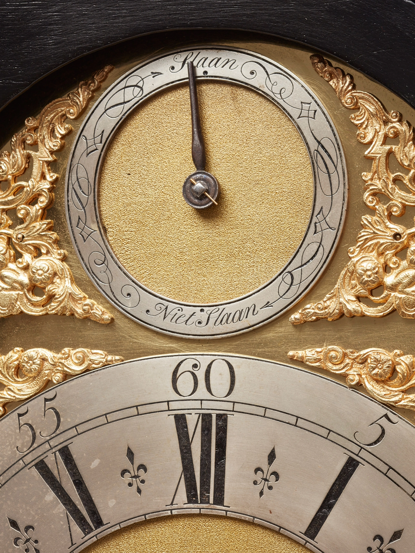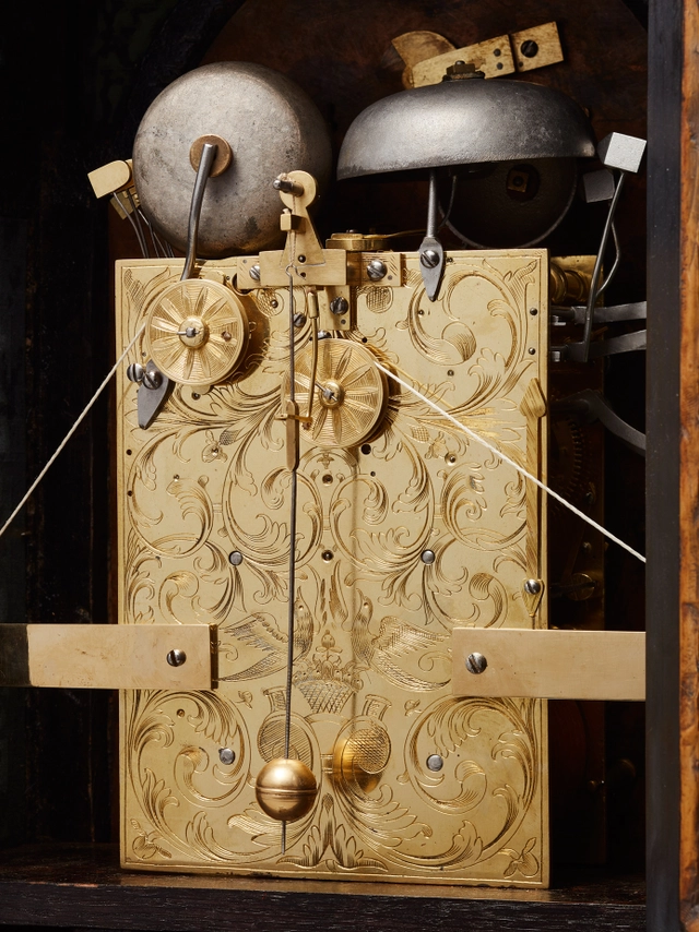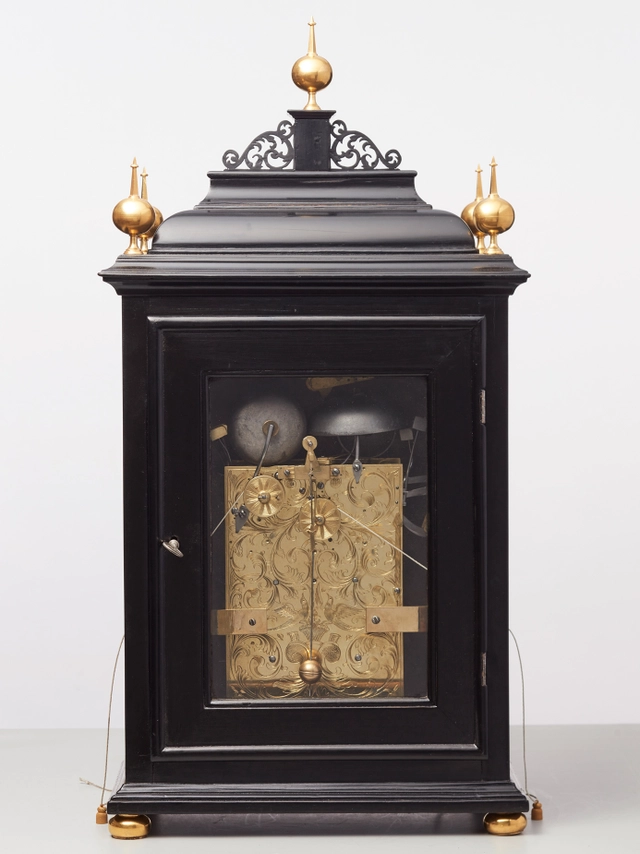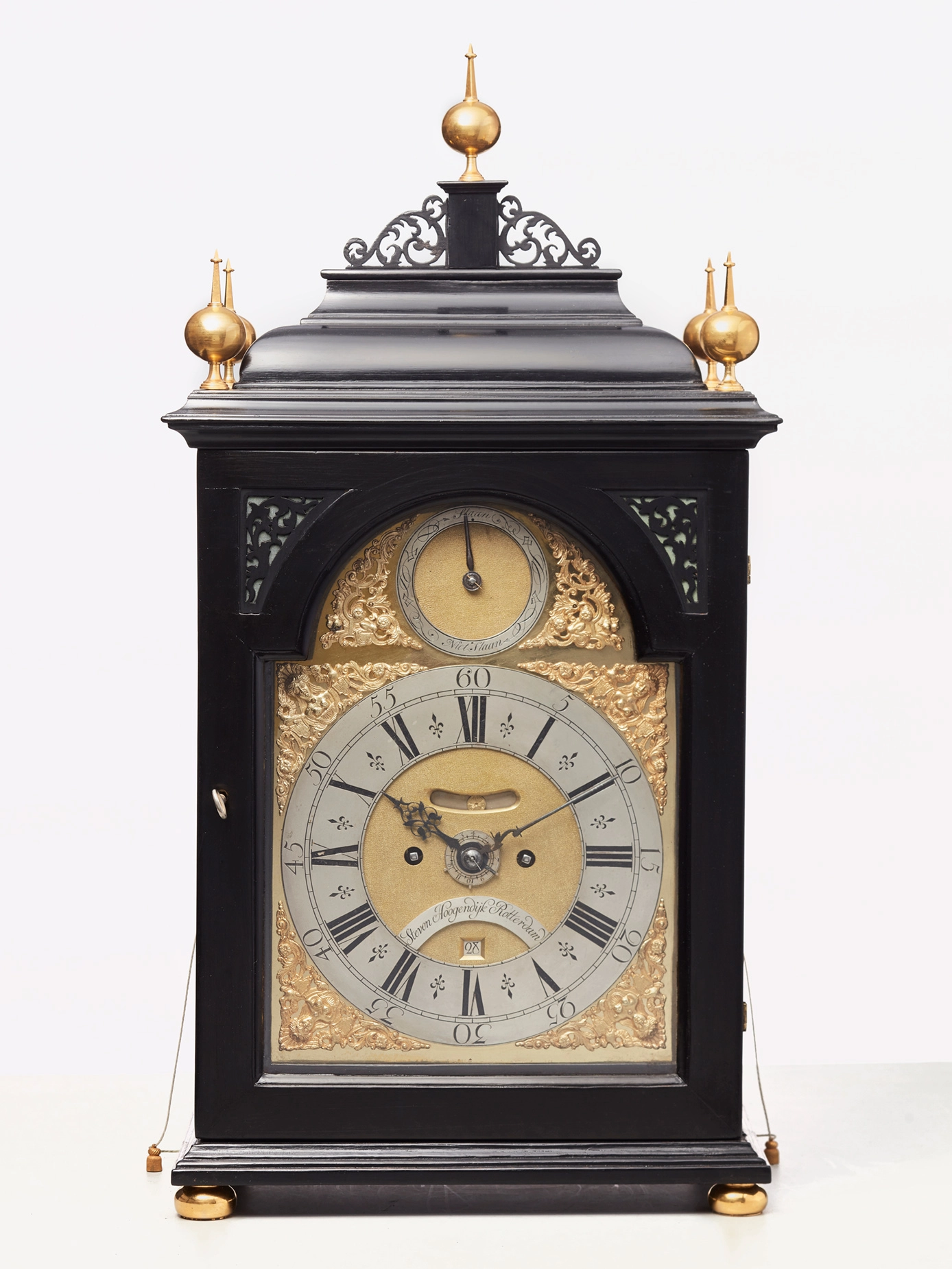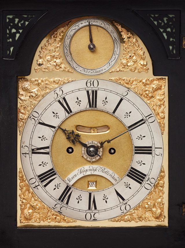 Een Hollandse gezwarte tafelklok met datum, dag en maanfase, door J.P. Kroese, omstreeks 1740