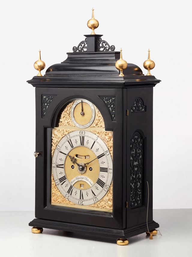 Een kleine Engelse gezwarte tafelklok met maanfase, door Robert Wood, omstreeks 1770