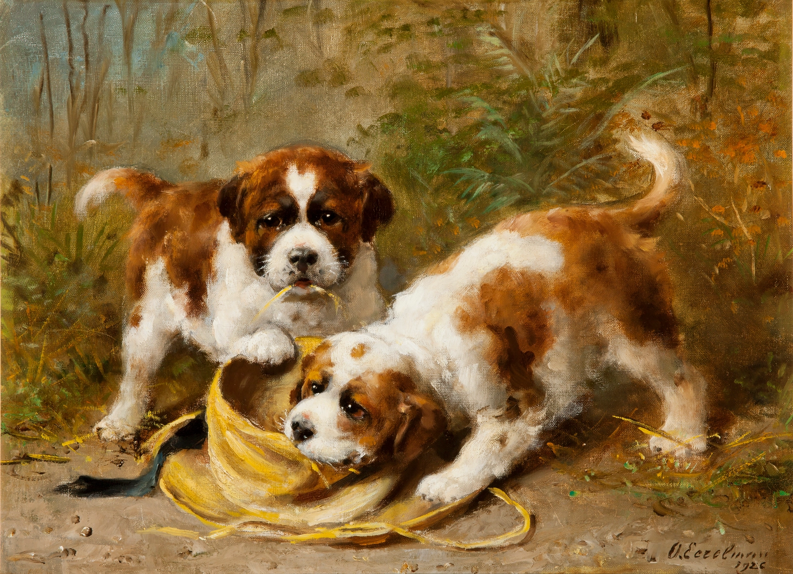 Twee Sint Bernard puppies spelend met een hoed - Otto Eerelman