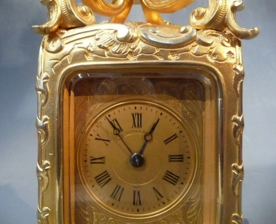 Vergulde gorge case reisklok met wekker en slagwerk, Le Roy et Fils, Paris 1870.