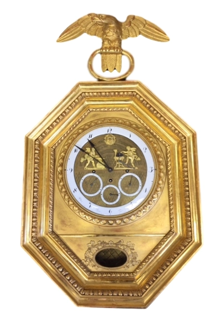 Een Oostenrijkse verguld houten figurale klok met dubbel mechaniek, omstreeks 1830