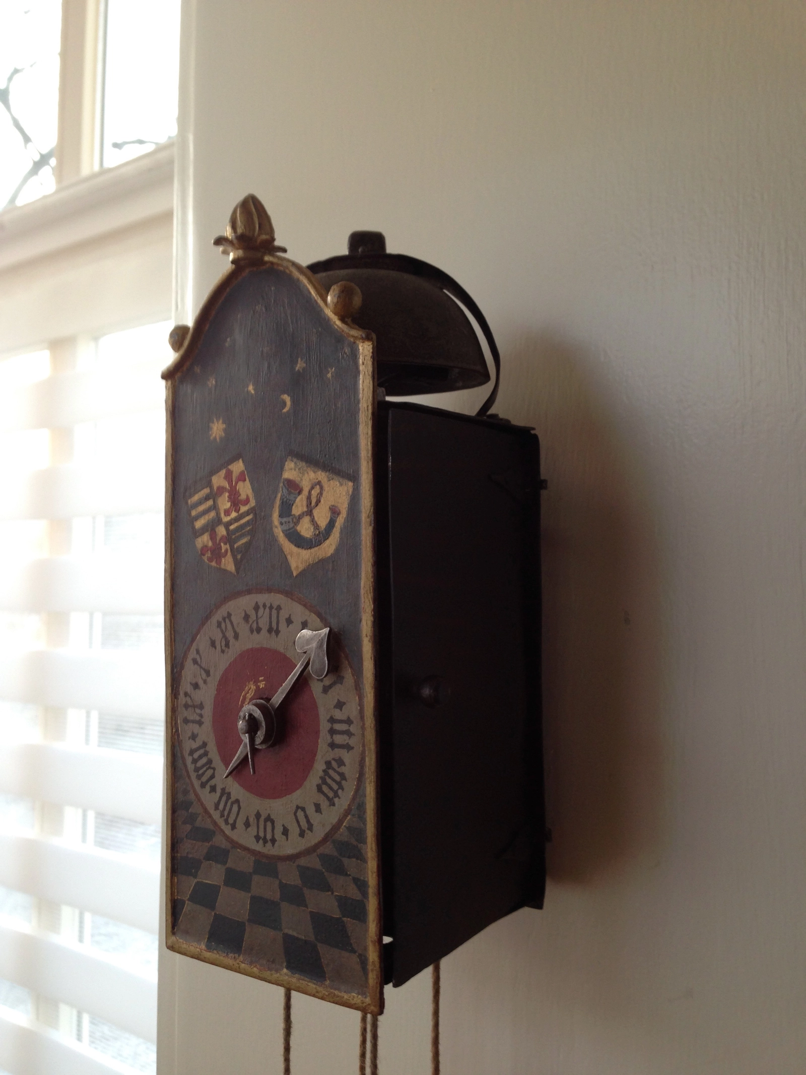 Een miniatuur Duits 'Schwarzwalder' latoenen en houten zogenaamd 'Sorg' wandklokje, omstreeks 1840