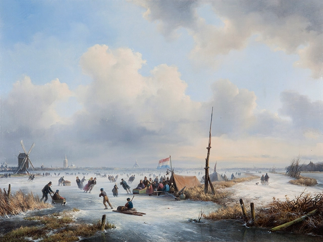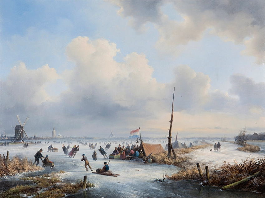 Dutch winterlanschap with three windmills and a koek-and-zopie