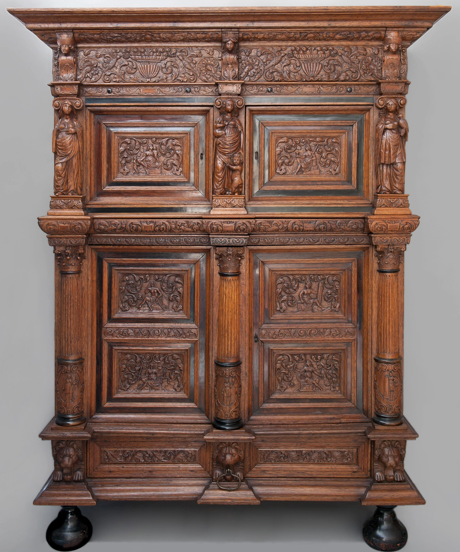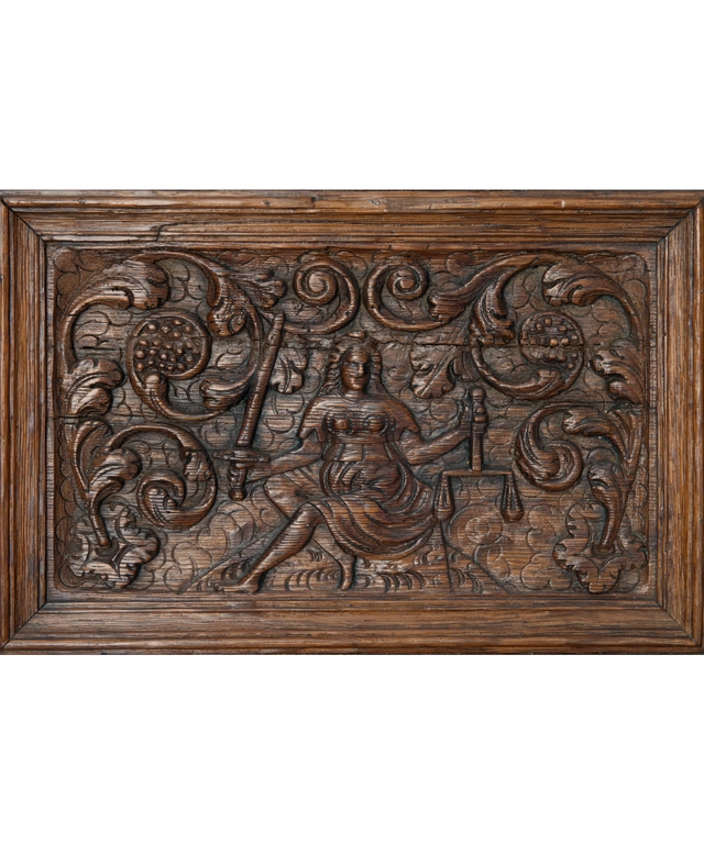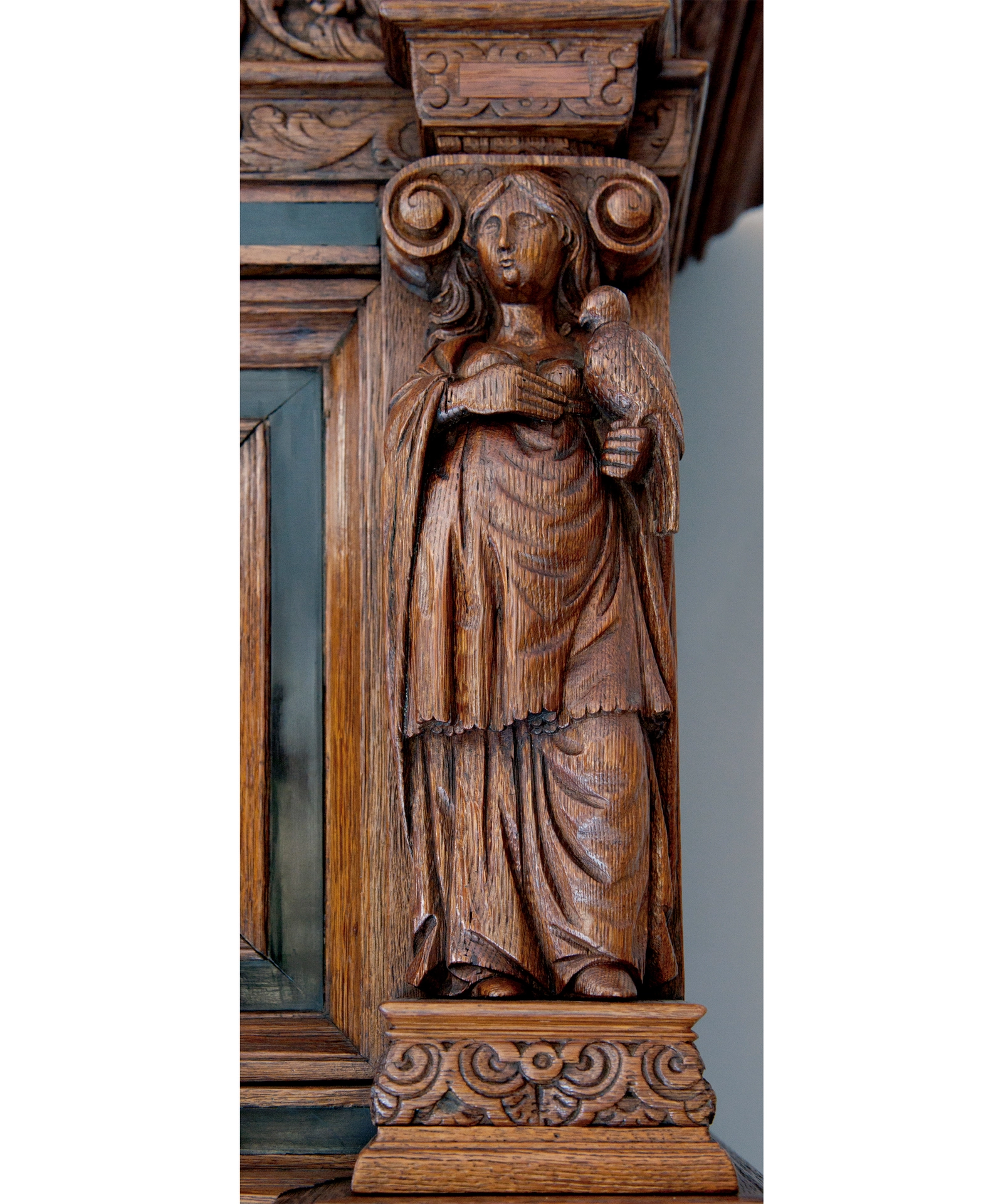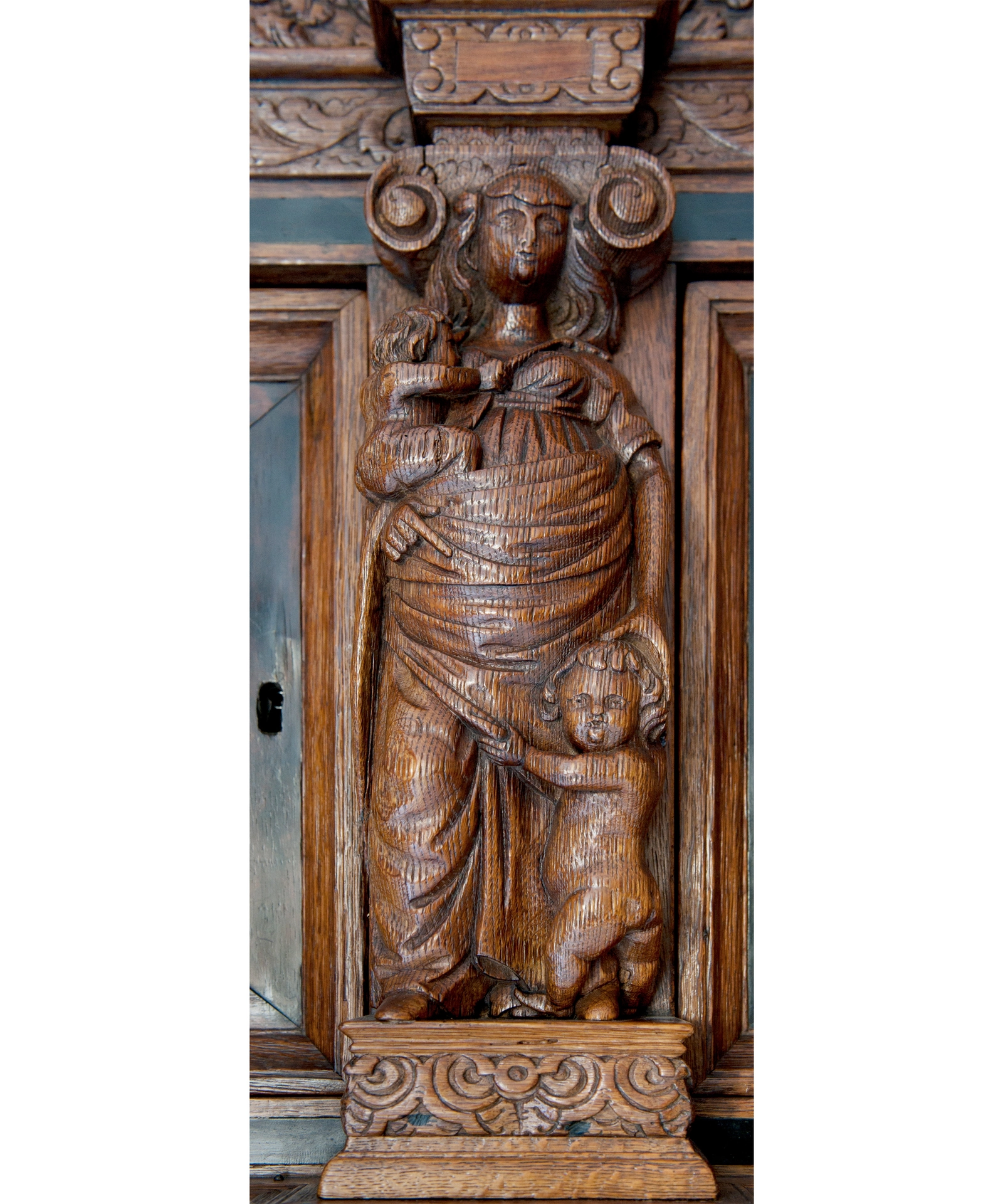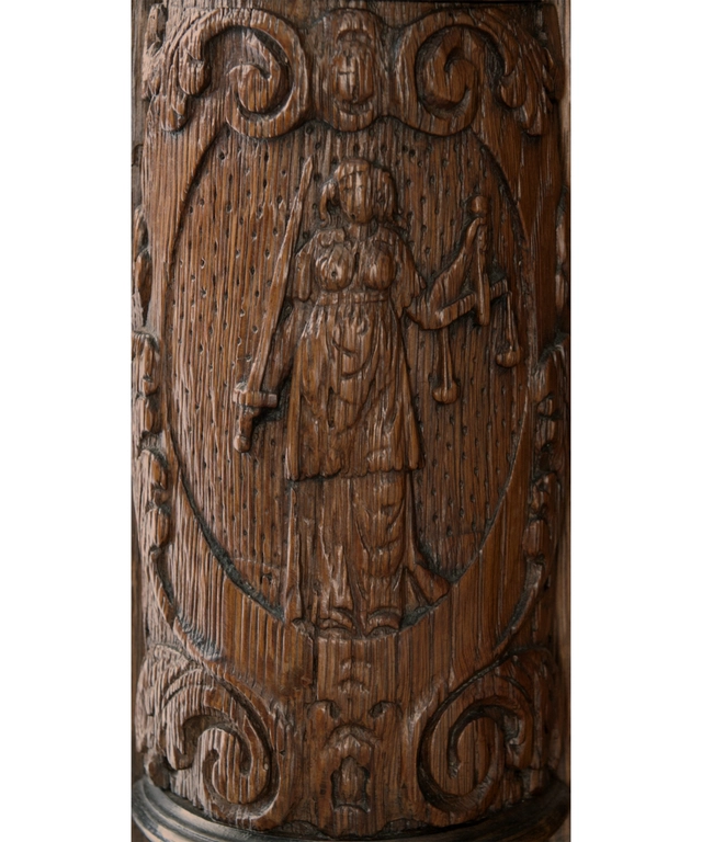 De deuren van de kast zijn voorzien van de gesneden panelen, vier in de onderkast, twee in de bovenkast, omgeven met gesneden eikenhouten lijsten en ebbenhouten strips. In deze panelen zijn wederom de zeven deugden weergegeven omringt door rankwerk. In de bovenkast vinden we links nogmaals Caritas, en rechts Temperantia. Op de linkerdeur van de onderkast Spes en daaronder Justitia, op de linkerdeur Fortitudo en daaronder Prudentia. In de onderkast wordt de verticale lijn doorgezet met drie gecanneleerde halfzuilen voorzien van Korinthische kapitelen eindigend op een cartouche met daarin wederom drie personificaties; Justitia geheel links, in het midden Prudentia en geheel rechts Fortitudo.