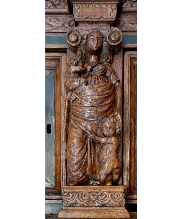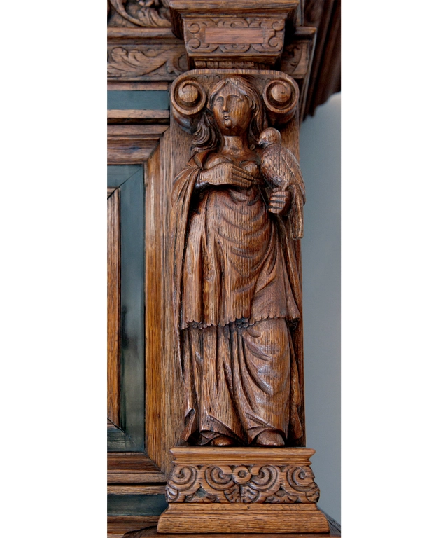 Op deze kast zijn de personificaties van de zeven voornaamste christelijke deugden afgebeeld. Deze deugden zijn herkenbaar doordat ze zijn afgebeeld met hun bijbehorende attributen. Zo identificeren we de drie ‘goddelijke deugden’: *Fides*, (Geloof - herkenbaar aan het boek), *Spes*, (Hoop - met het anker en de papegaai) en *Caritas*, (Liefde - met kinderen).