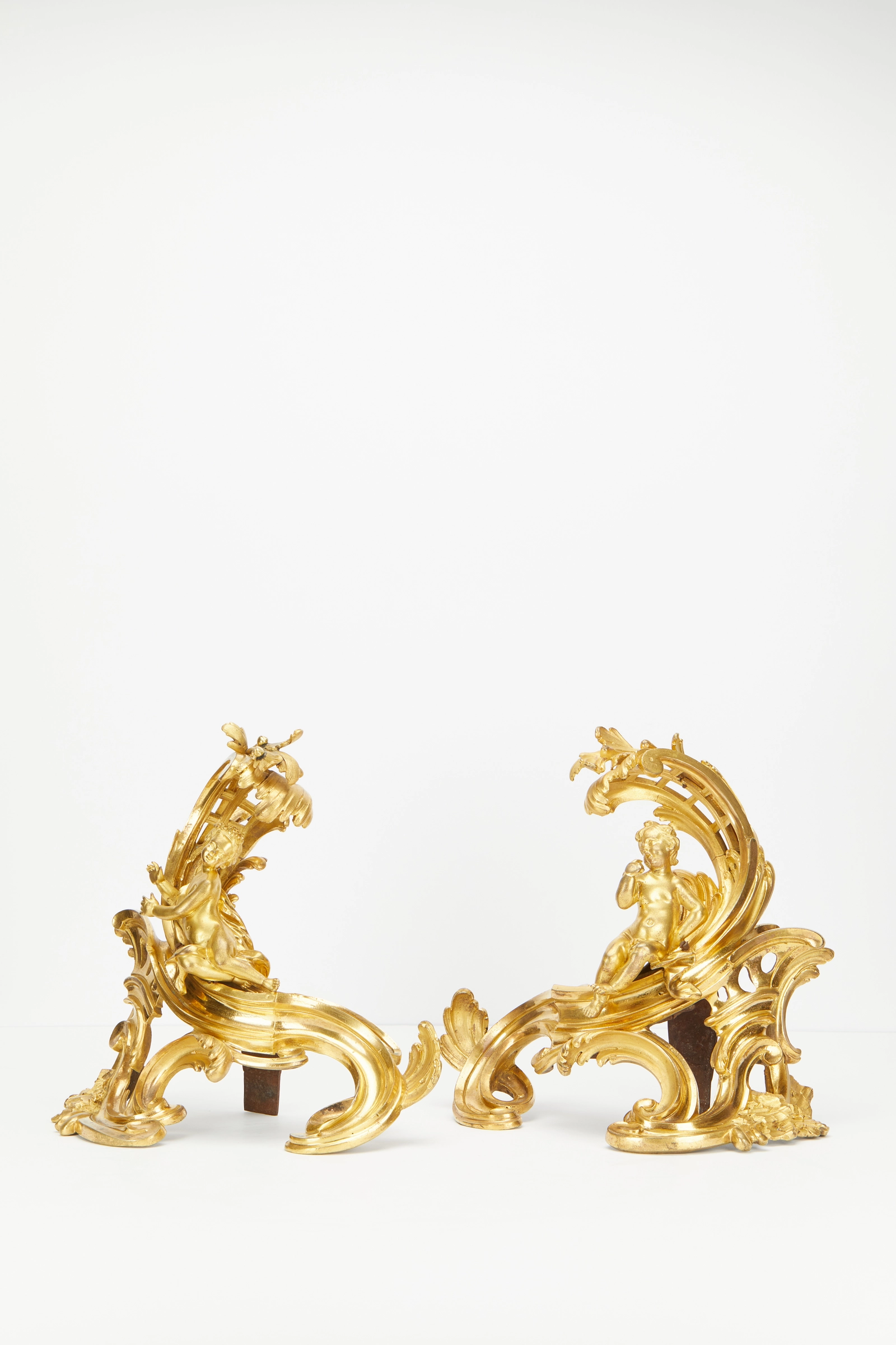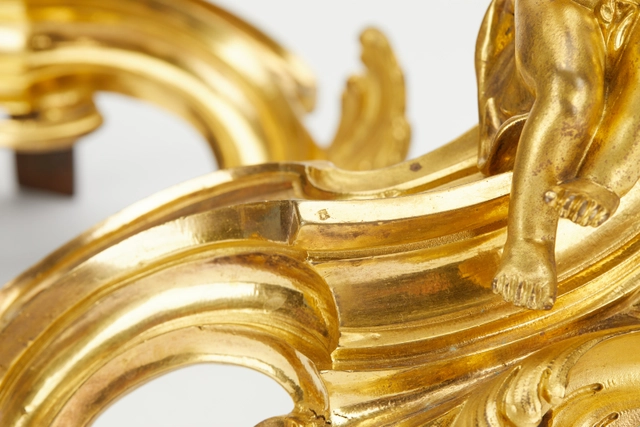 Amazing good looking Louis XV pair of high quality 18th century andirons with lovely detailed cupido’s warming symbolic their hands before the fireplace. The so-called Crown stamps in the bronzes are tax stamps used from approximately 1742 until 1745 mucht sought after by collectors. The original gilding and subject also makes it very romantic.