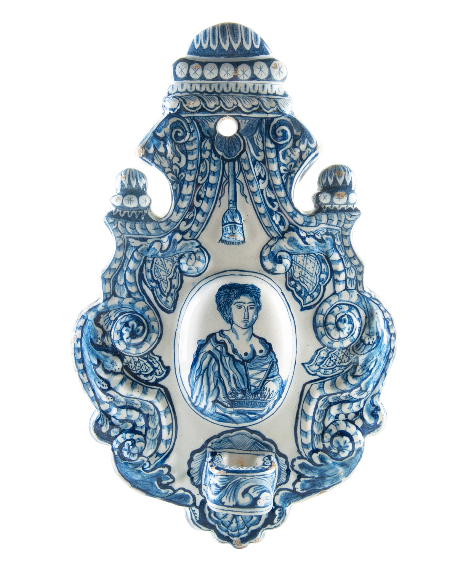A Blue and White Dutch Delft Earthenware Sconce Decorated with a Figure