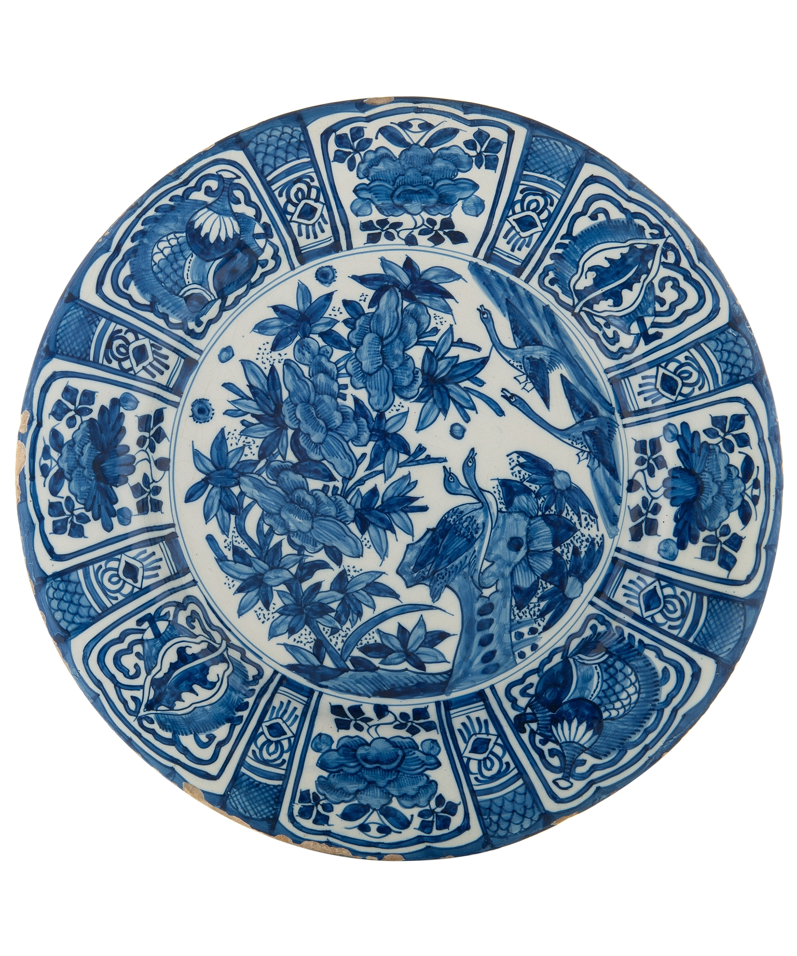 The rim of the dish is decorated with alternating fan-shaped panels, separated by narrow panels of