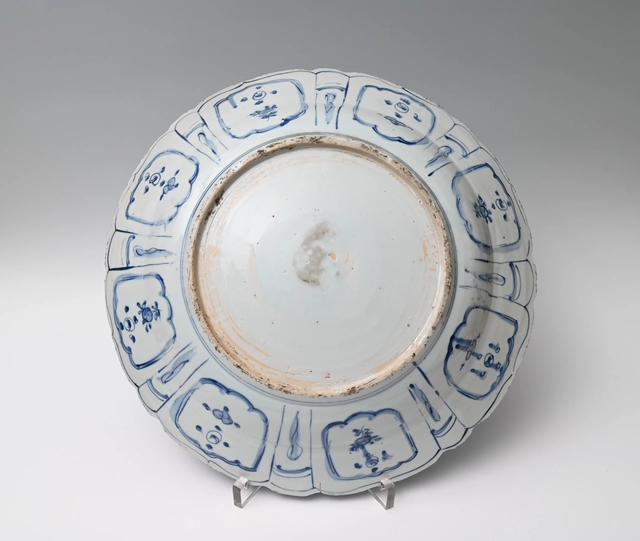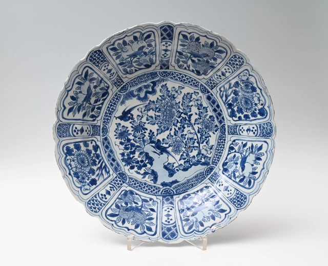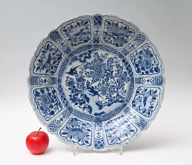 With a garden design with rock and birds, flowering trees and peaches along the outer edge.
