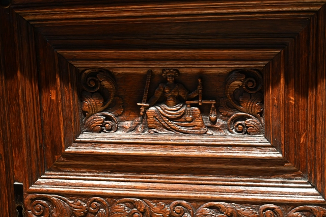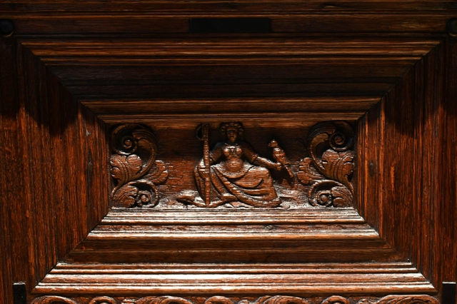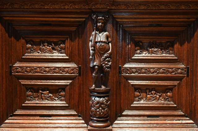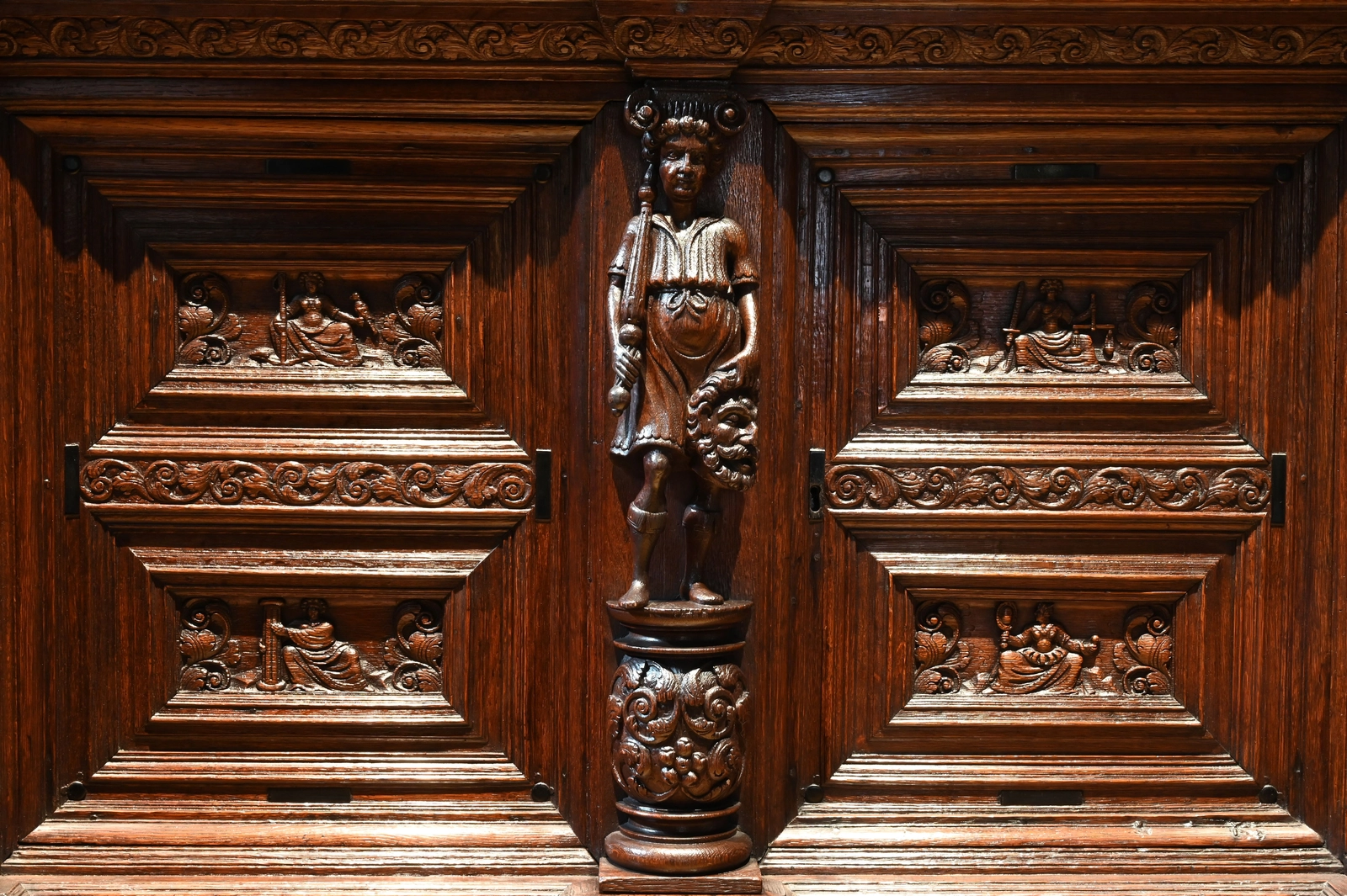 On the door panels, decorated with ebony cubes, the six virtues are depicted.