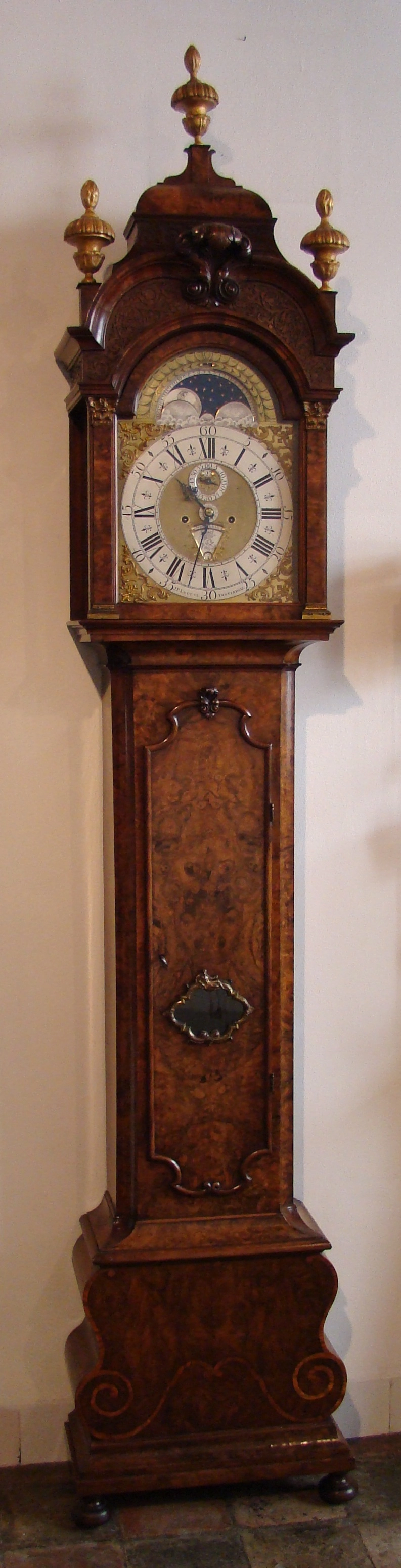 A fine Dutch burr walnut longcase clock with calendar Uswald Amsterdam circa 1750