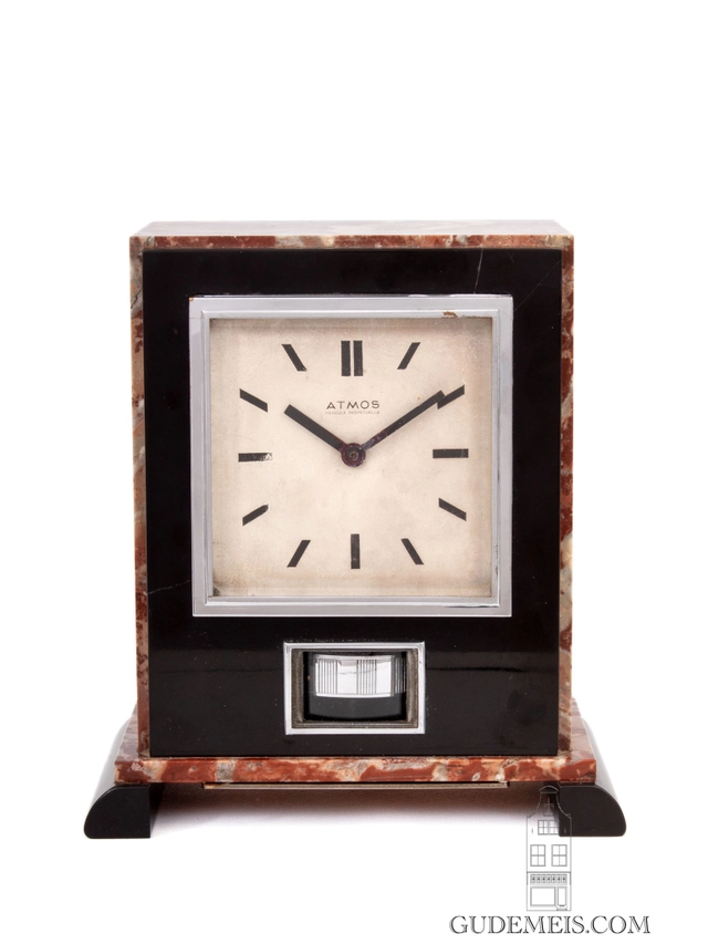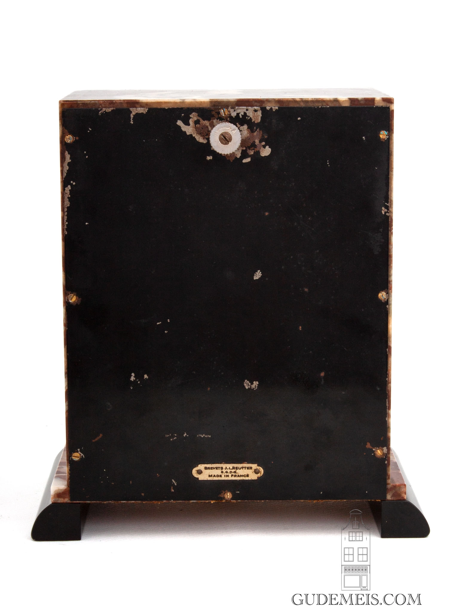 The rectangular case is made of black and red veined marble. Below the nickel plated door is a nickel lined aperture showing the balance wheel. The geometrical shape of this clock is typical for the Art Deco period. On the reverse is a plaque inscribed with Brevets J.L. Reutter s.g.d.g. made in France.