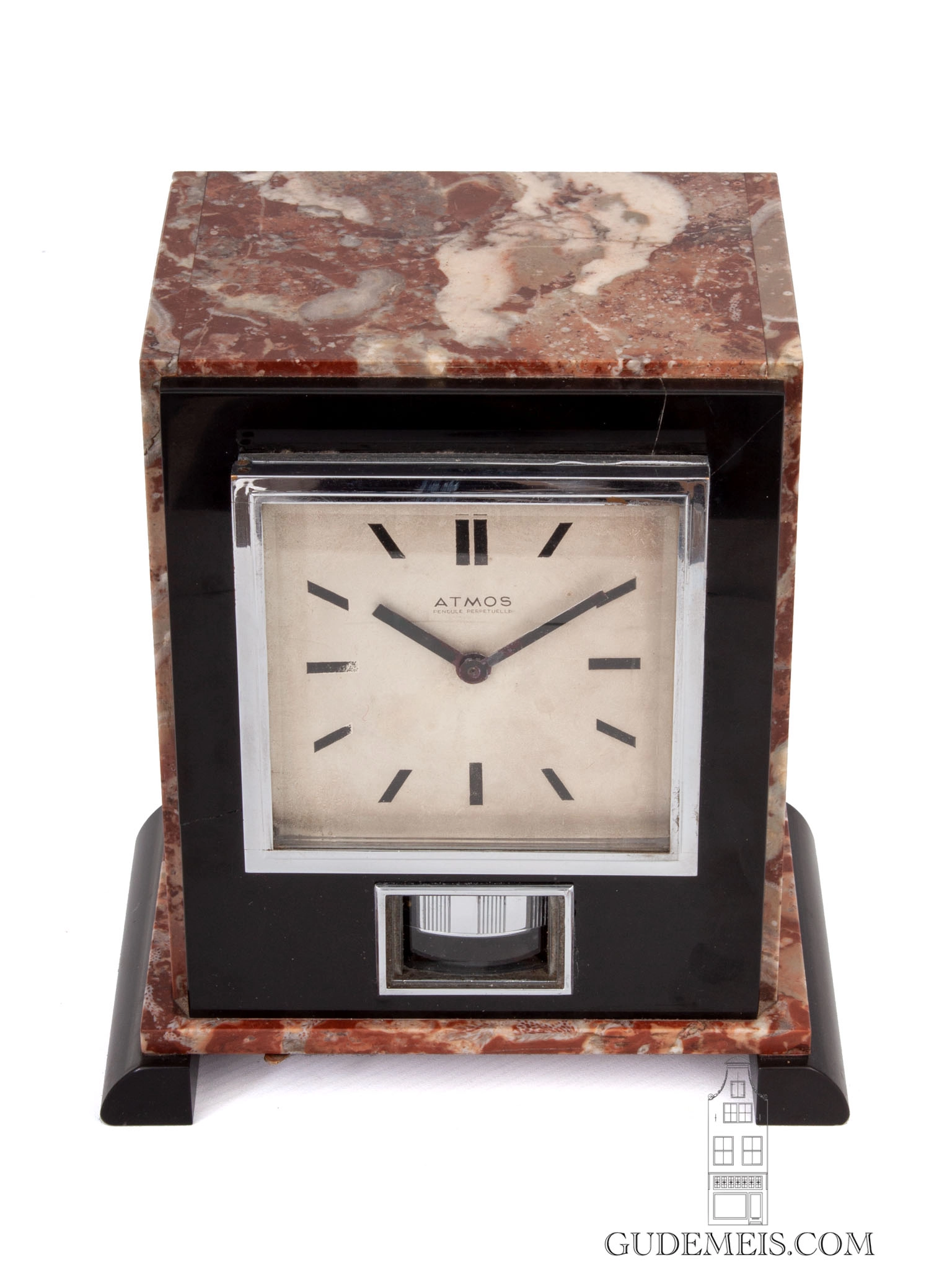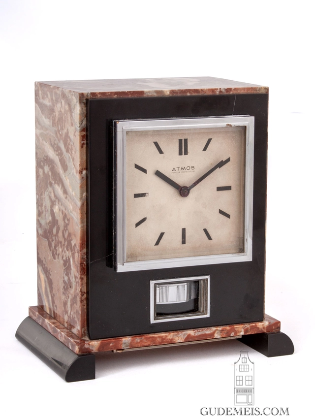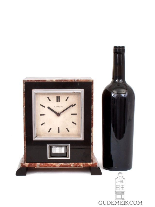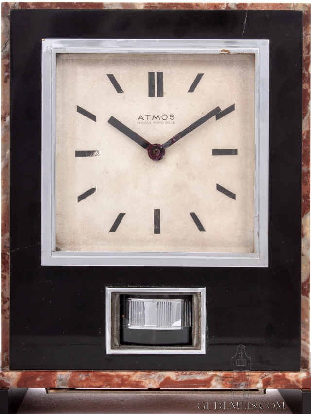 The 10-cm dial has baton hour markings and is inscribed ATMOS pendule perpetuelle. The straight hands are made of blued steel.