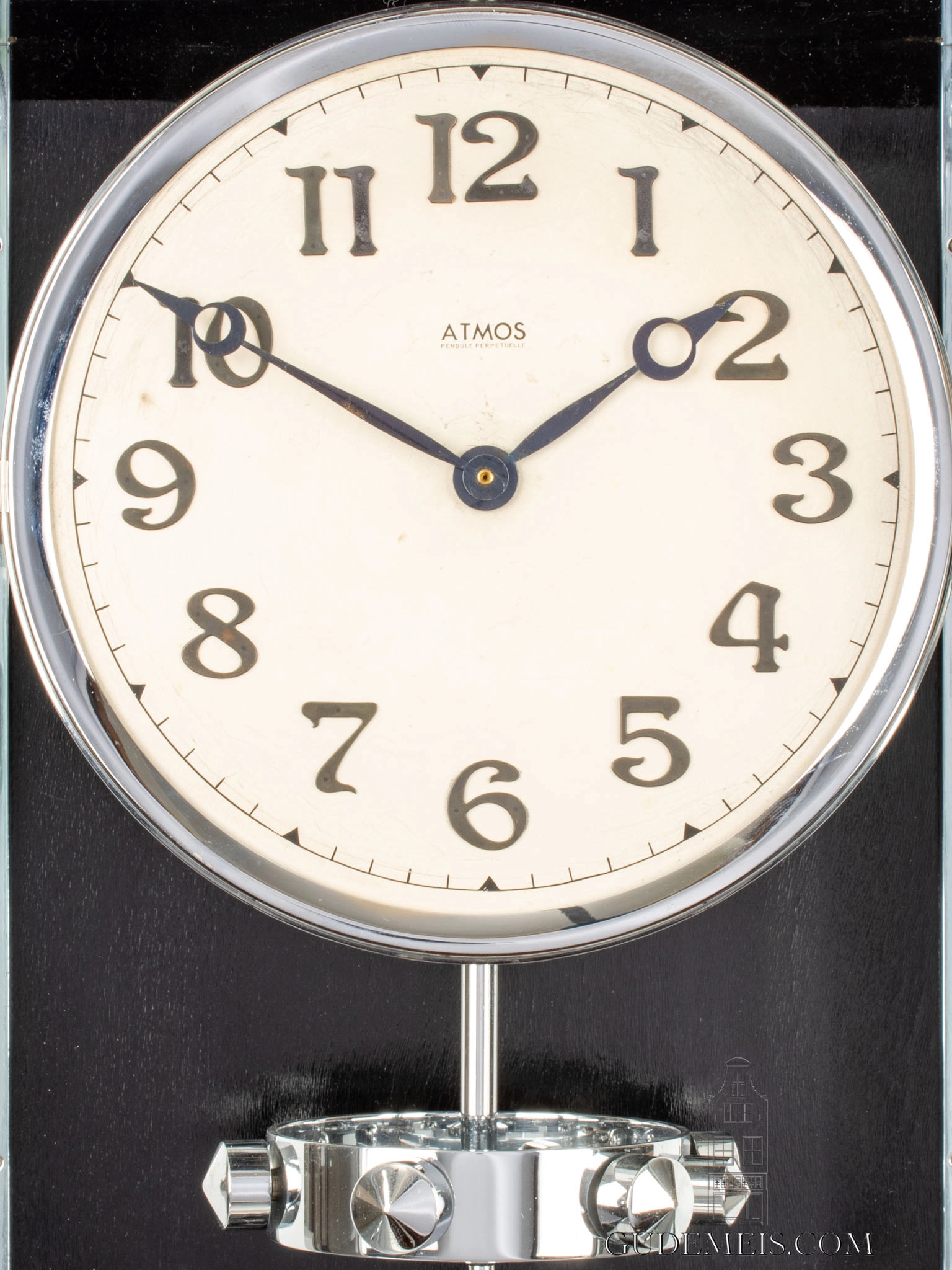 The lacquered dial has Arabic numerals and is signed ATMOS pendule perpetuelle below the 12. The black steel hands are of the Breguet type. The dial has a nickel-plated bezel.