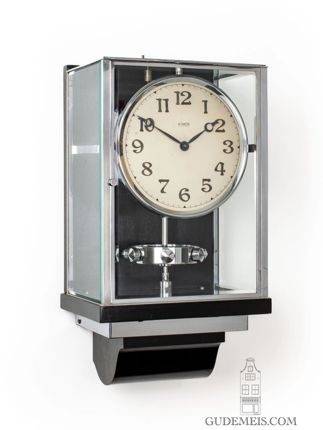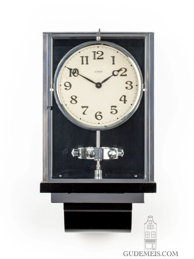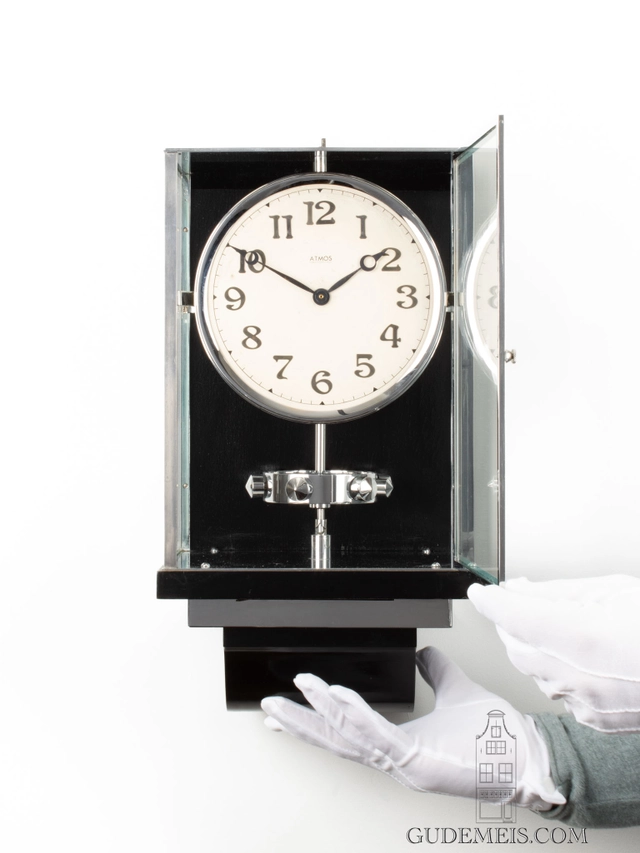 Jean-Léon Reutter presented his first prototype atmos clock in 1928. The ingenious movement that winds itself by means of temperature changes, received much appraisal and admiration. Around 1930 a commercial production was started of these clocks with many different cases. Besides the now known models with glass panels in a metal frame there were more traditional models based on antique clocks. There were also much more avant garde models. This is model RM 1 where the characteristics of Art Deco can be seen very clearly. The rectangular silhouette and geometric shapes are typical of this period, as are the numerals on the dial and the shape of the hands. This fine clock was and is a real design object.