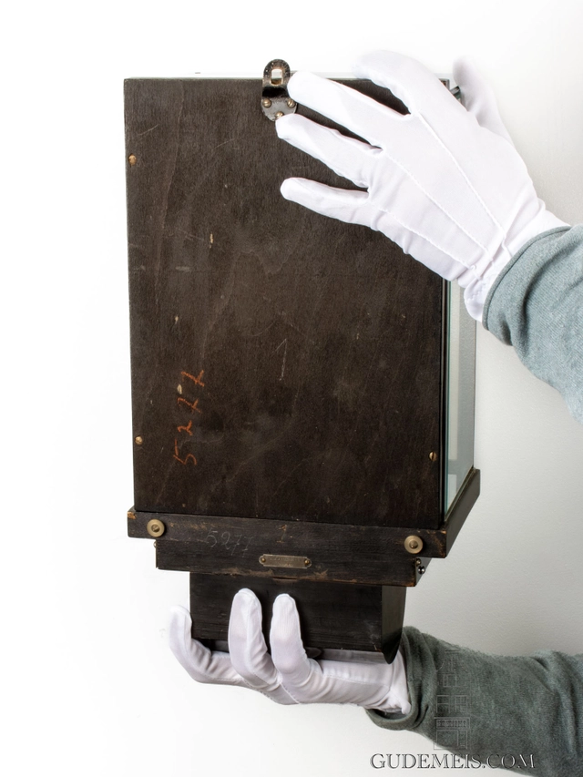 The rectangular nickel-plated case has glass panels on the front and sides. It is mounted on a black wooden back and base. Below it is a black wooden console separated by a nickel-plated divider. The case mounted on the wall by means of a suspension ring and has adjustment screws at the back.