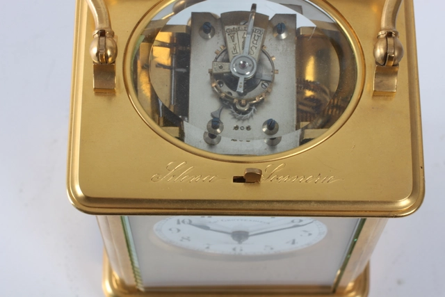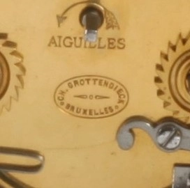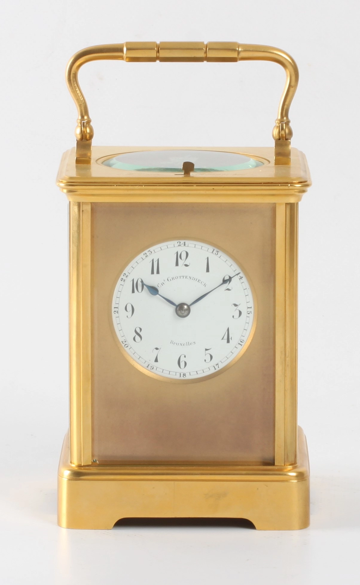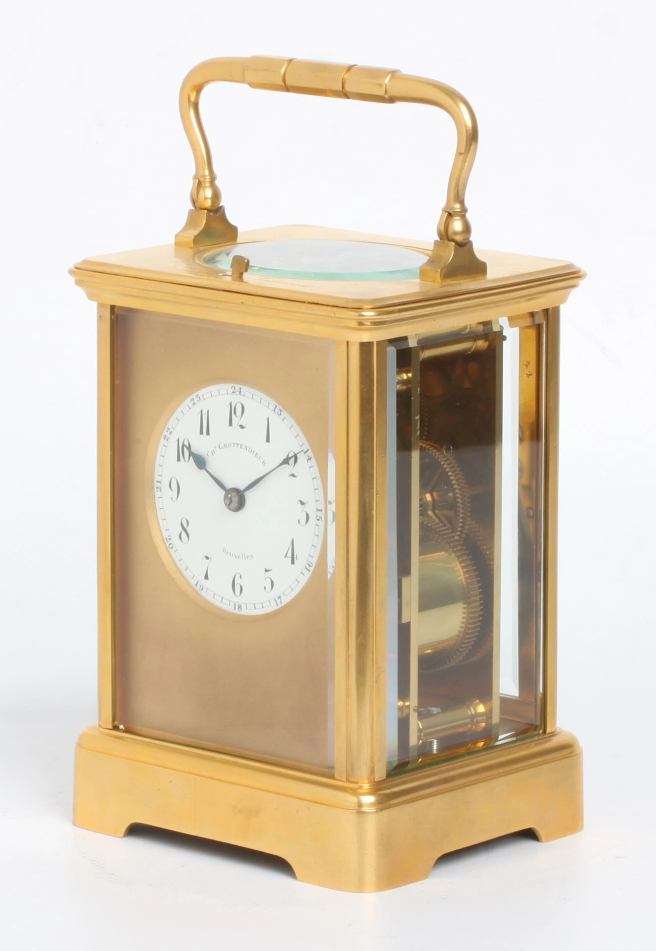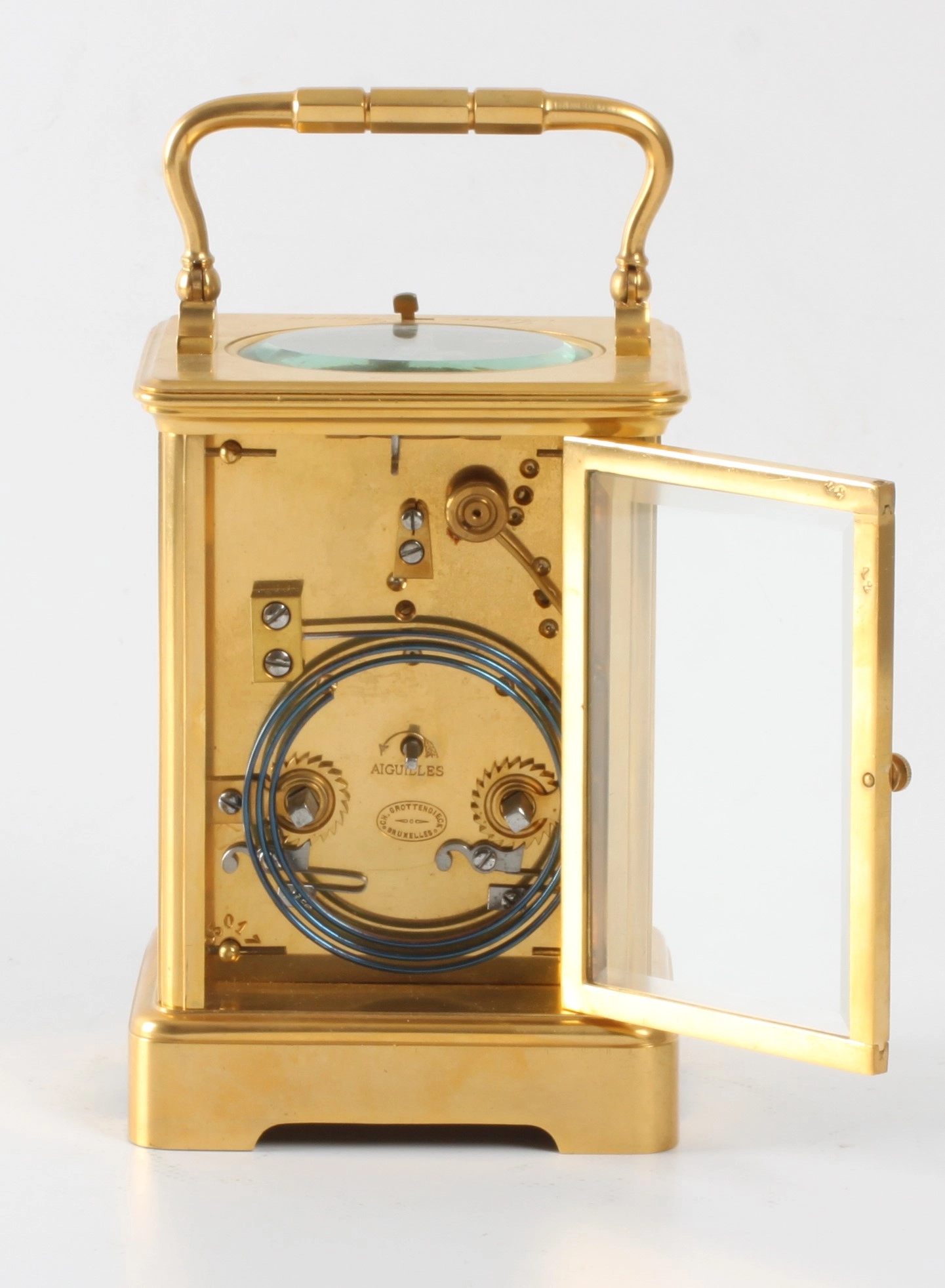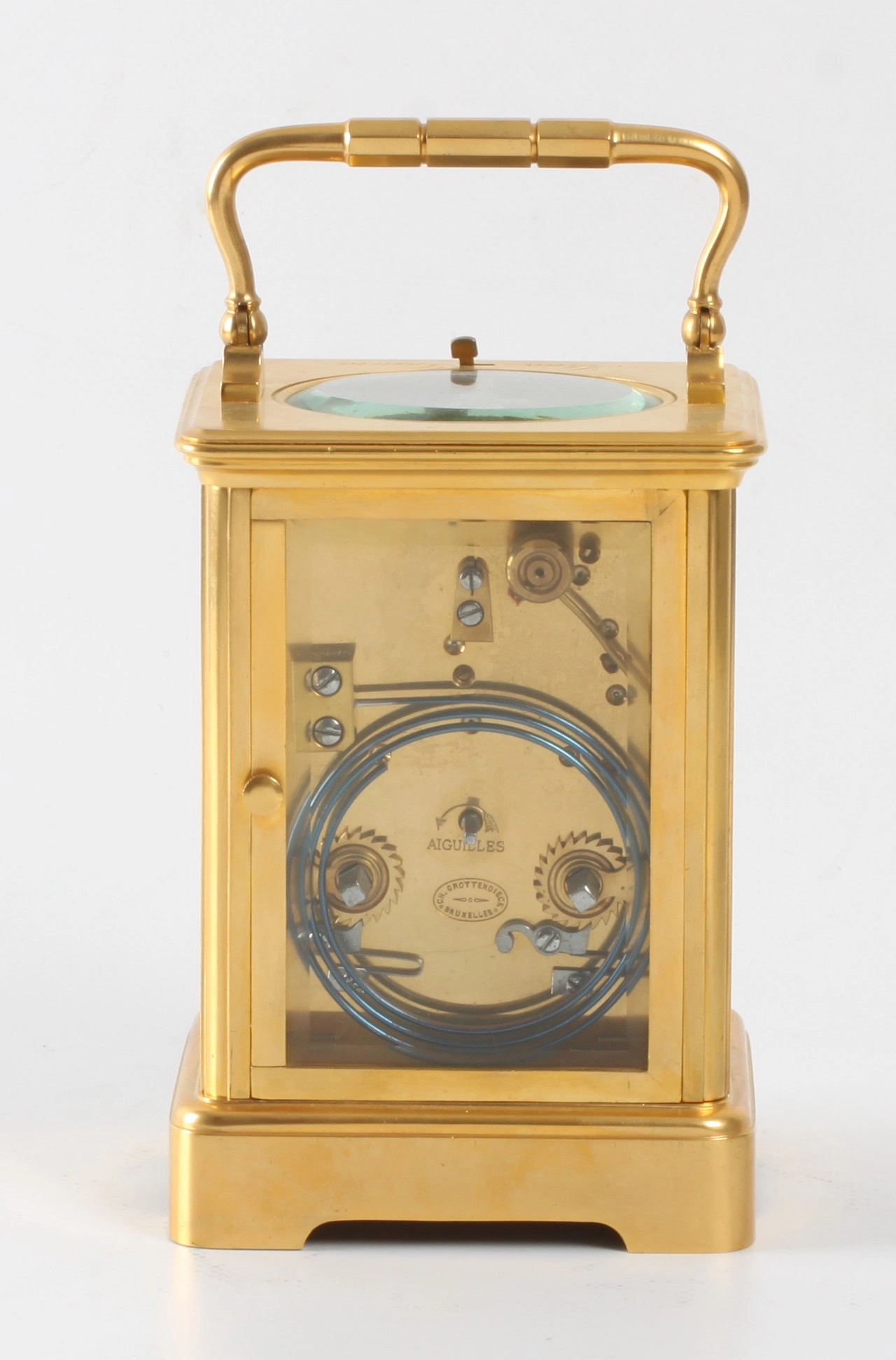 5-cm enamel dial with Arabic numerals signed for the retailer Chs Grottendieck Bruxelles, blued steel pear-shaped hands, spring-driven identically signed movement with platform anchor escapement of 8-day duration, rare 10 minute striking with 5 blows on a gong for doctor consult, lever for strike/silent on top of the gilt brass Corniche case inset with beveled glass panels, signed on the bottom Ed Chartier Paris.