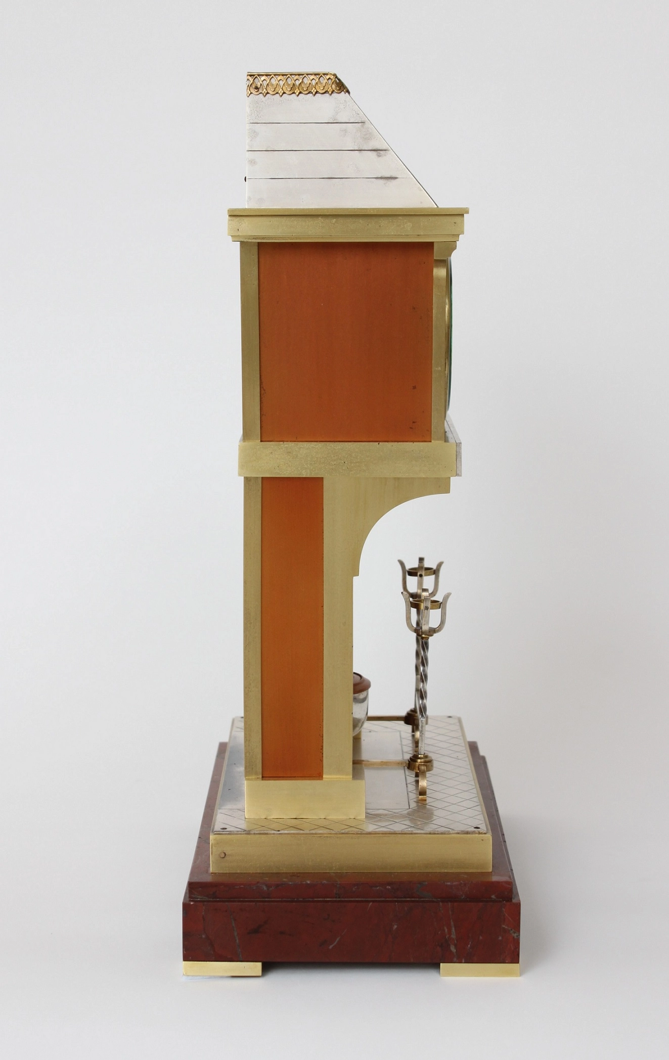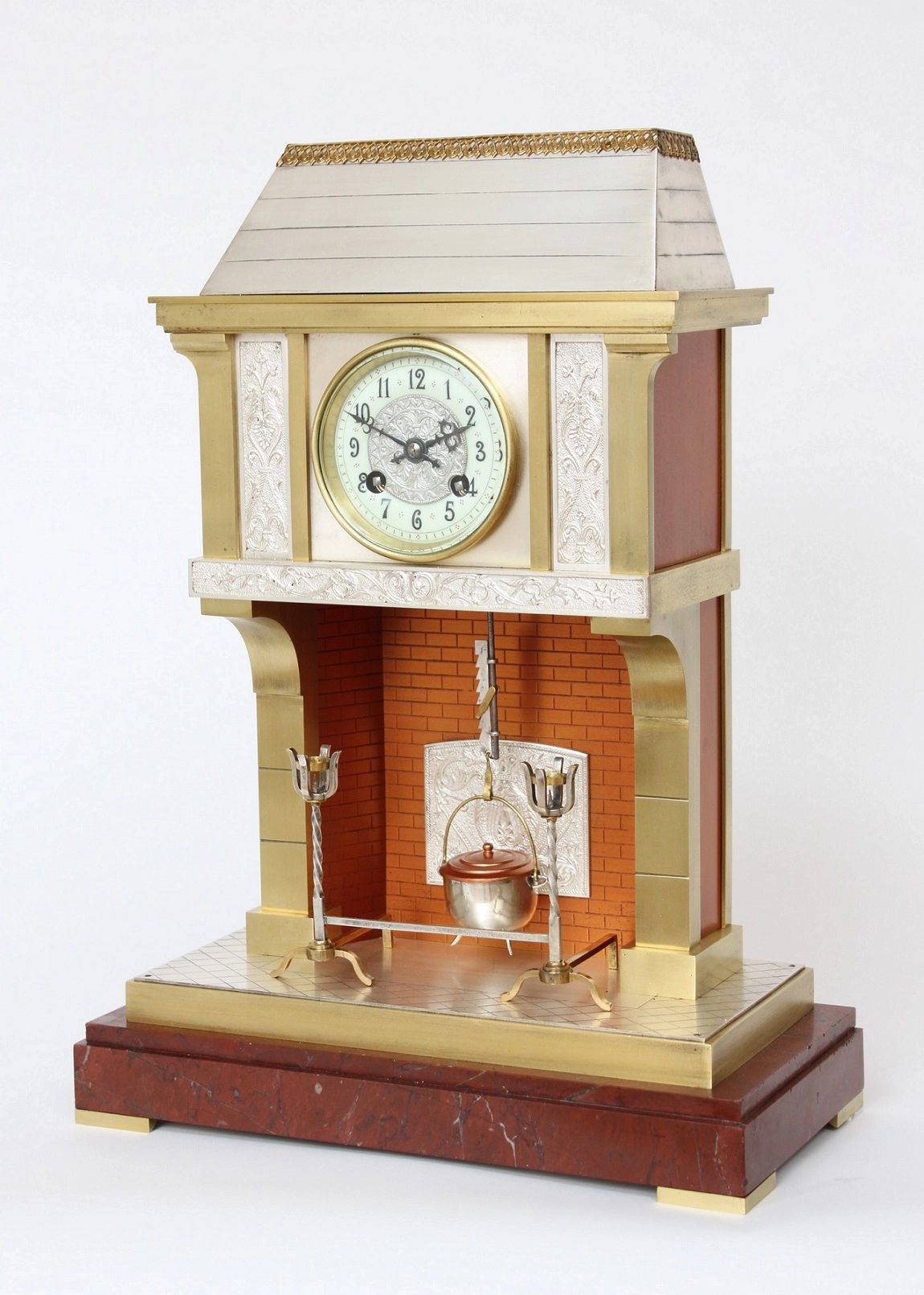The brass case case of this lovely industrial mantel clock shaped as a fireplace has a silvered roof with an engraved surface. At the top it is adorned with a gilt pierced border. The silvered and brass freeze incorporating the dial has a foliate relief surface. The light red fireplace has an engraved brick work pattern with centrally a silvered hearth stone. The outside formed by brass brick work blocks. The silvered floor formed by an engraved tile pattern. On it, there are the trivets connected by a bar. The whole mounted on a red marble base placed on flat brass feet.