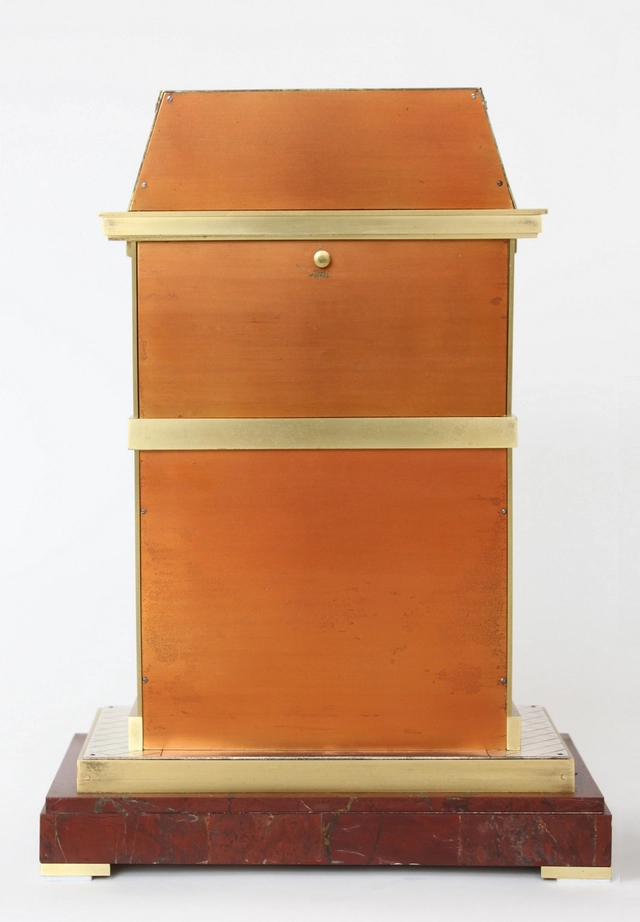 This French brass and marble industrial mantel clock in the shape of a fireplace can be attributed to Guilmet. The Parisian firm was specialized in mystery and industrial clocks. Although not all of these clocks have a direct connection to the industrial revolution, the type is clearly distinctive from other clocks. There are obviously industrial subjects, but also maritime and automated clocks like windmills and light houses. Derek Roberts, Mystery, Novelty and Fantasy Clocks, 1999 Atglen USA pp. 253-284.