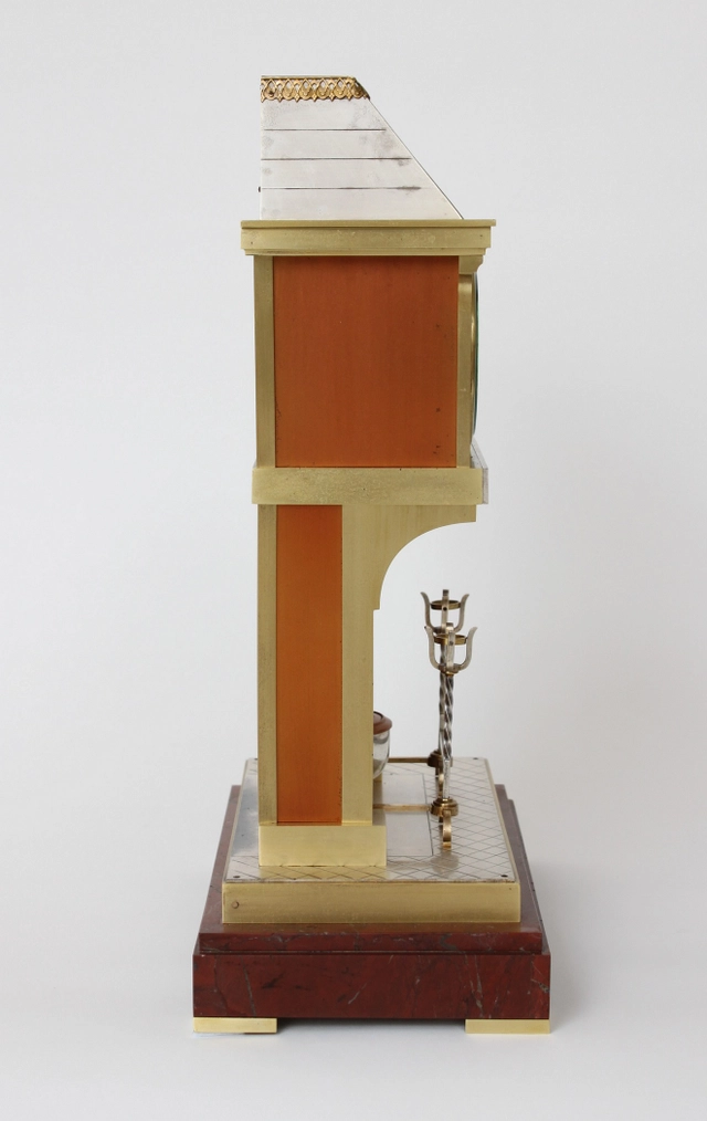 The 8-day movement is driven by two spring barrels, one for time and the other for the striking work. The clock strikes once on the half hour and all the hours on the full hour with rack striking on a gong. The going train is regulated by a Brocot anchor in combination by a pendulum. The pendulum is formed by the kettle in the fireplace which means that the kettle swings from left to right.