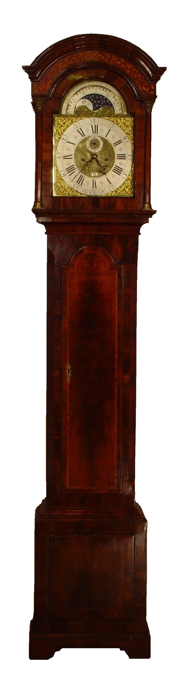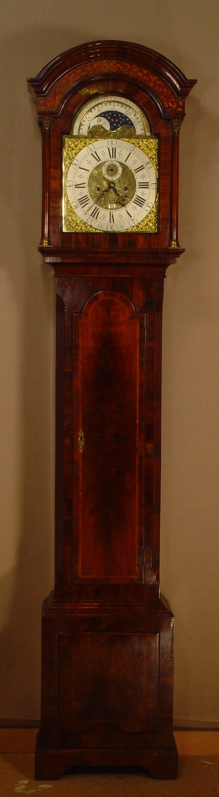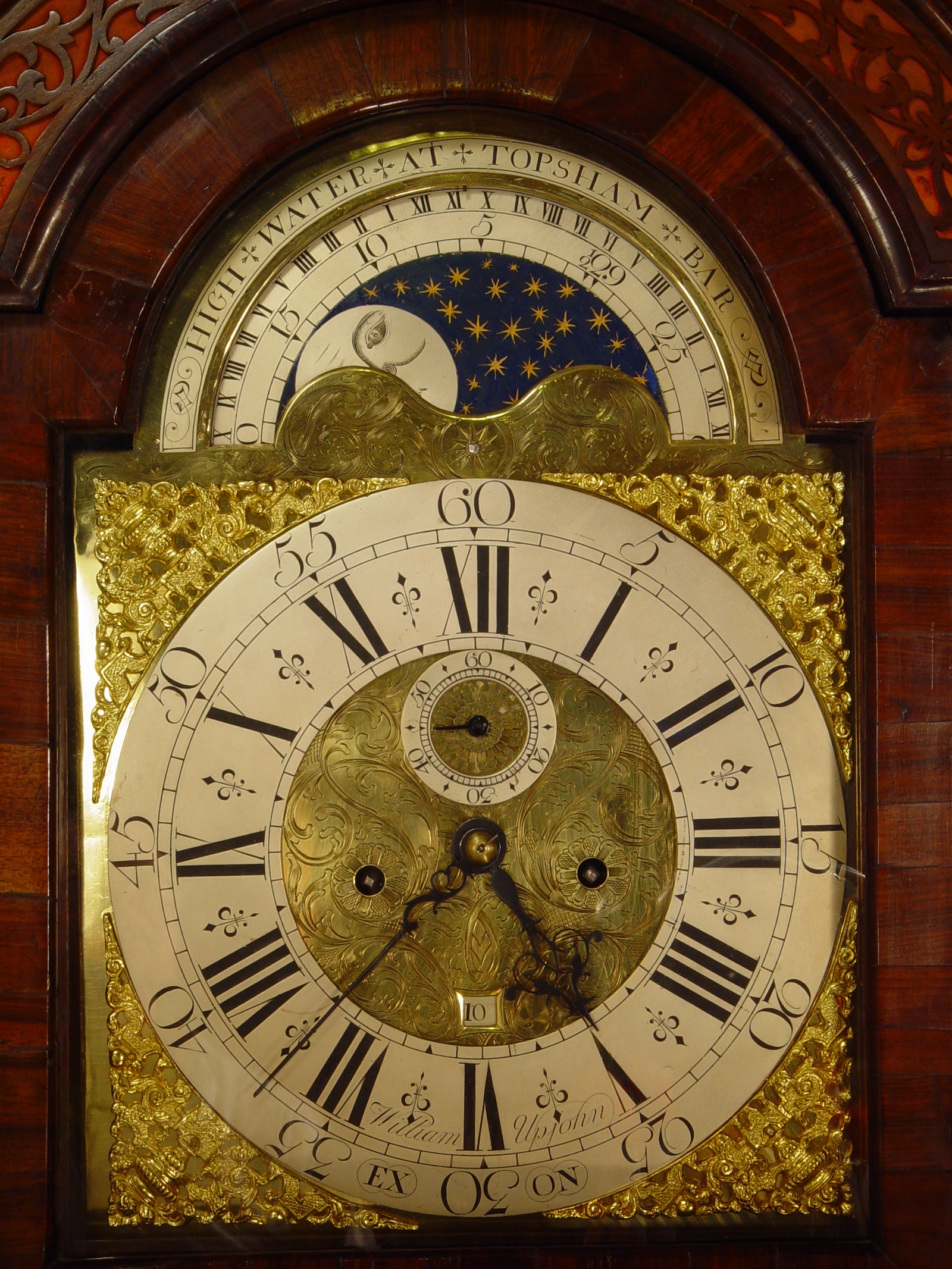 arched brass dial with silvered engraved chapter ring signed William Upjohn Exon, blued hands and finely pierced gilt mask spandrels, foliate engraved centre with subsidiary seconds and date aperture, lovely moonphase in the arch with tide indication; High Water At Topsham Bay, 8-day movement with anchor escapement and rack hour striking on a bell, case with well figured walnut and lovely old patina, moulded break arck hood with glazed door flanked by columns with brass capitals and bases, long break arch door flanked by fluted canted sides, square base with panel raised on bracket feet.
