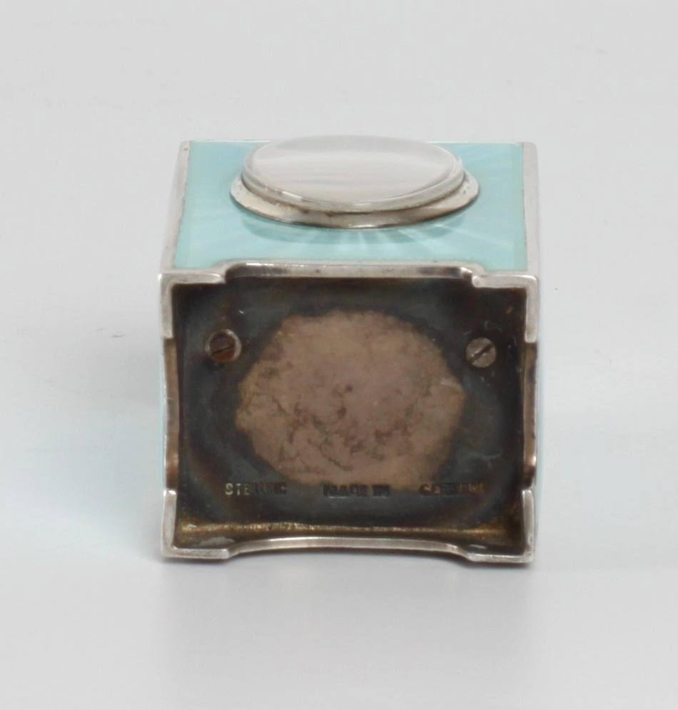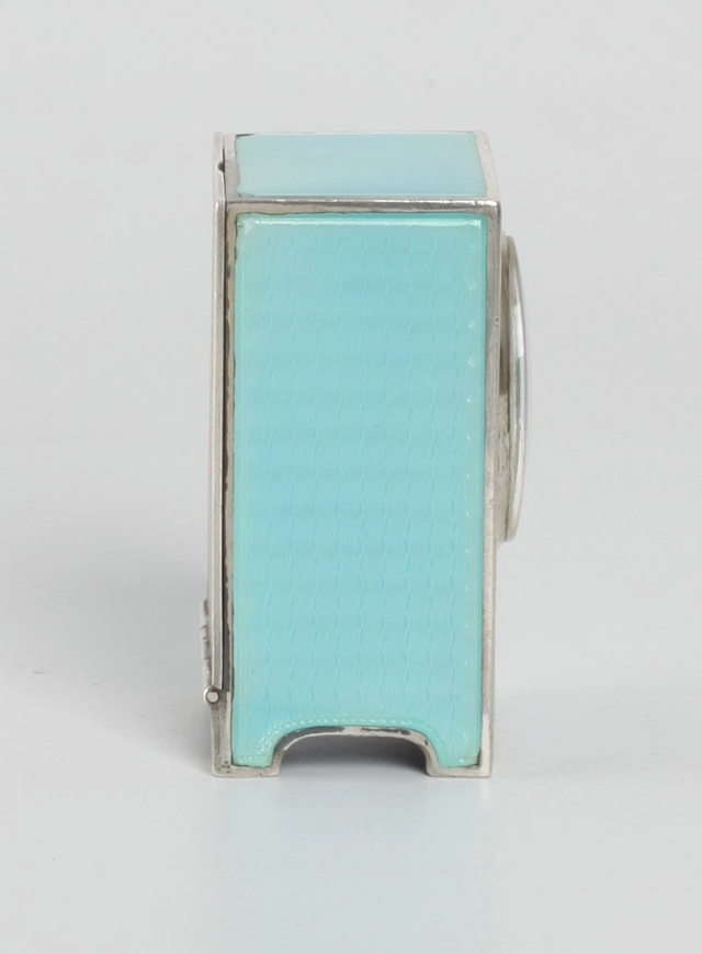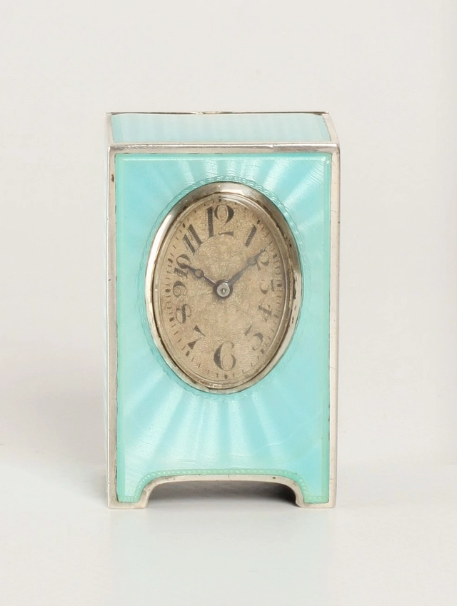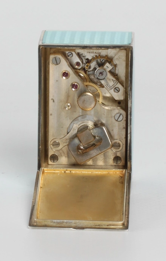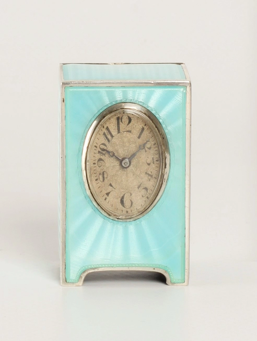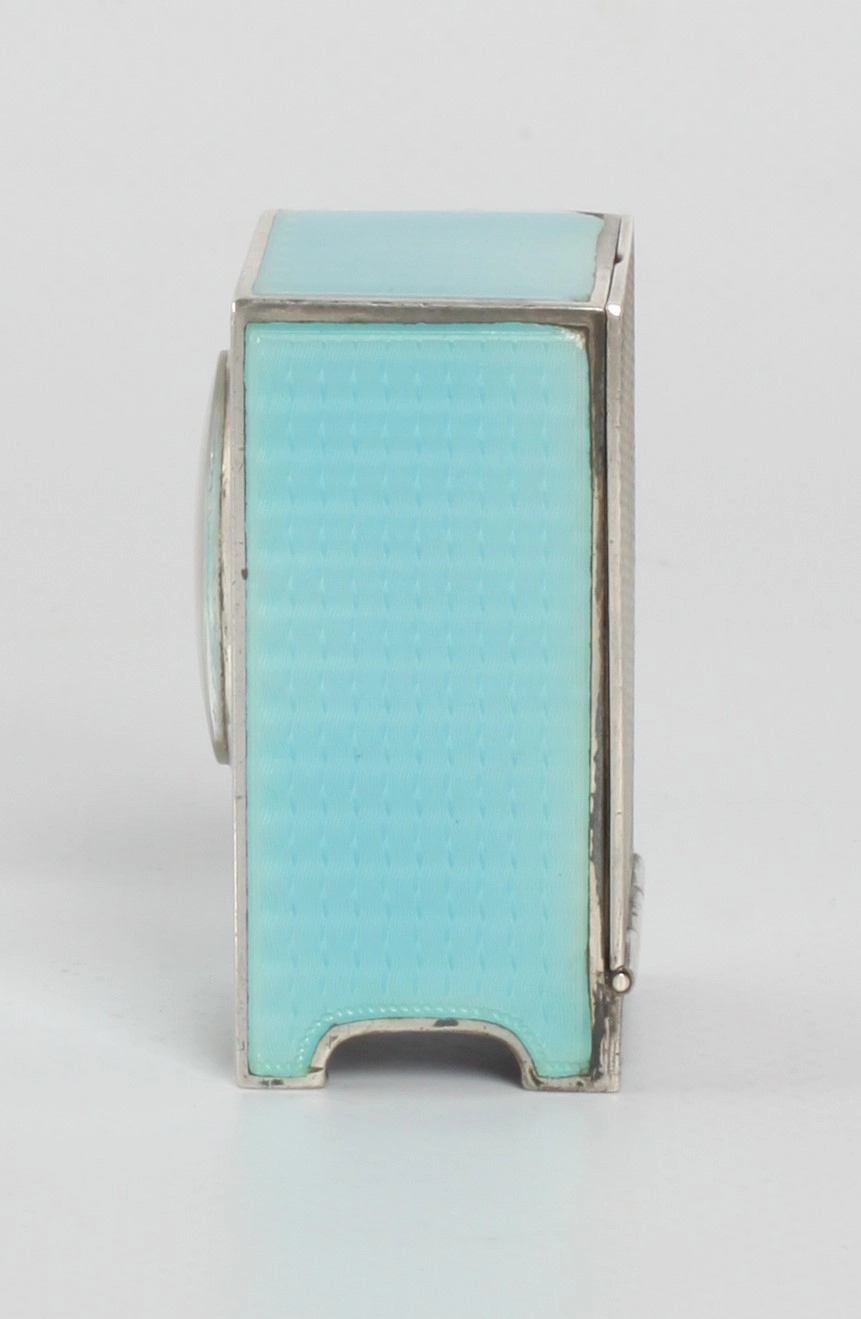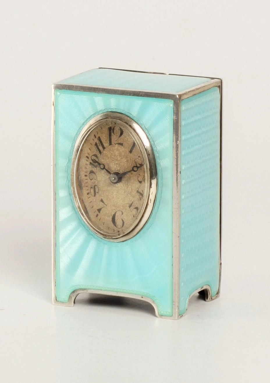 A sub miniature Swiss Art Deco guilloche enamel travel clock, circa 1920