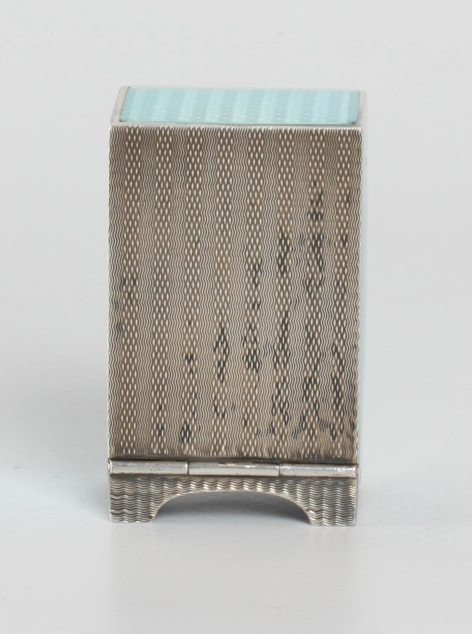 oval silvered guilloche dial with Arabic numerals and blued Breguet hands, spring-driven movement with anchor escapement marked 15 jewels Muitaine Mey Ajustments two Swiss of 8 day duration, rectangular silver case geometrical guilloche engraved under a light blue translucent enamel.