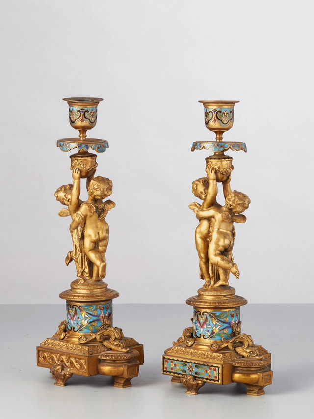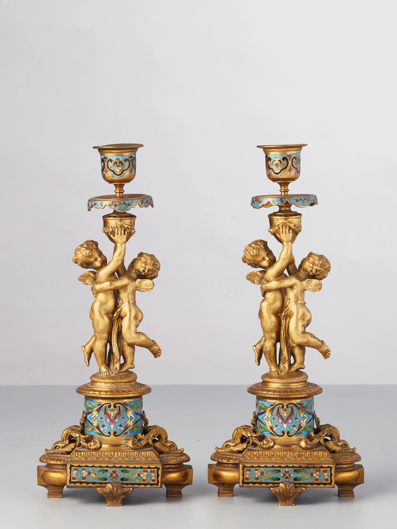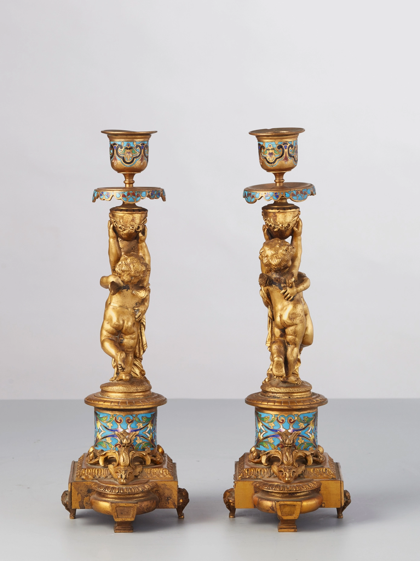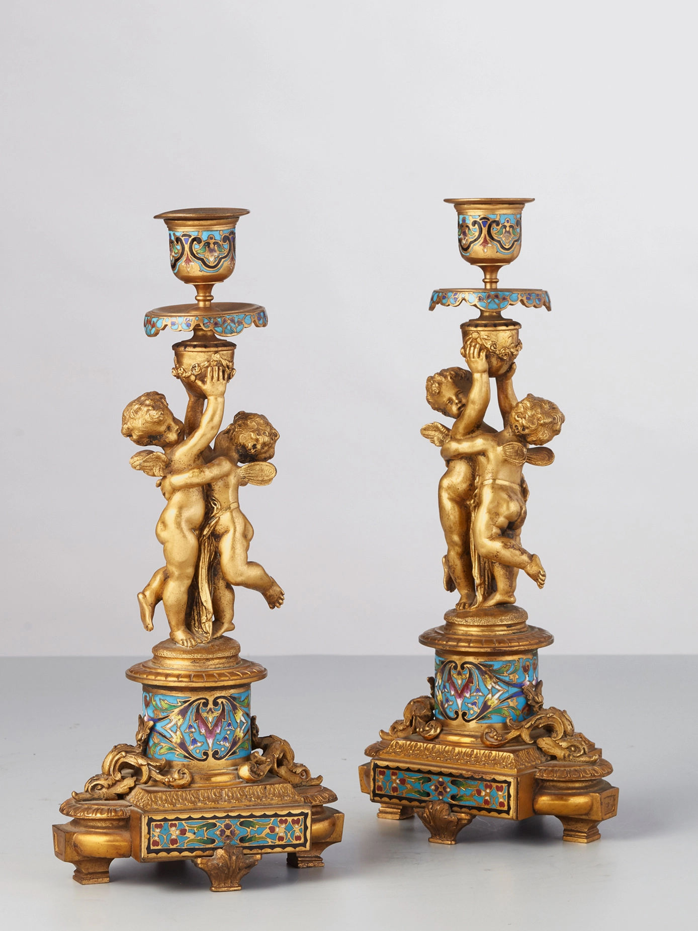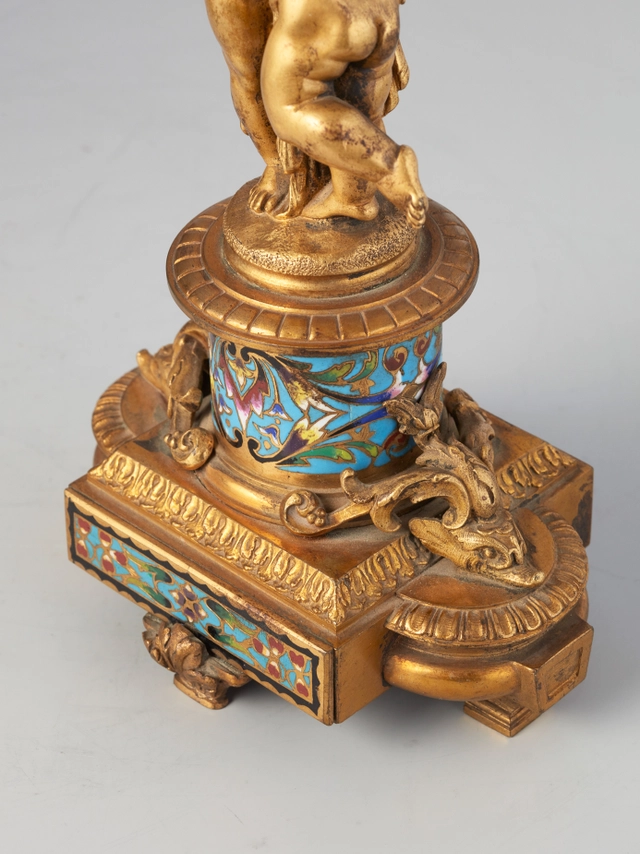 A pair of French ormolu and patinated bronze candlesticks, after Alfons Giroux, circa 1880