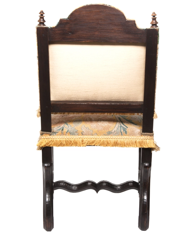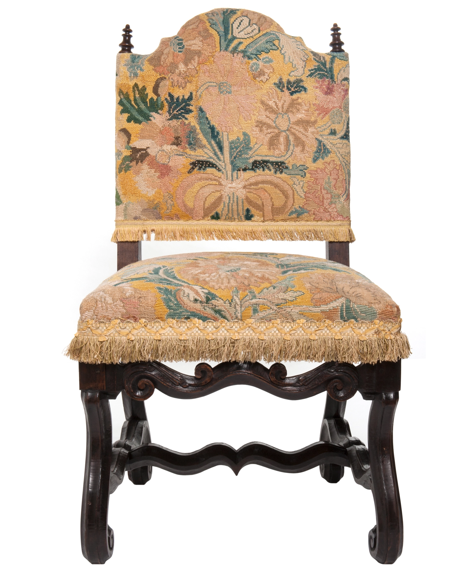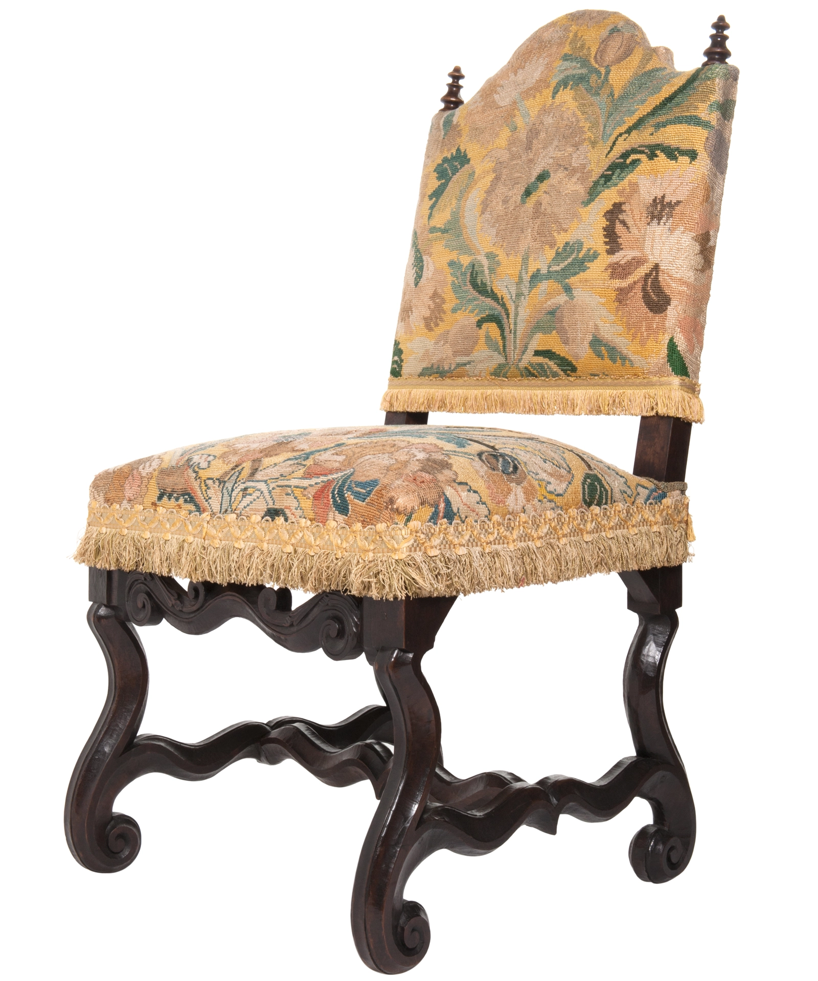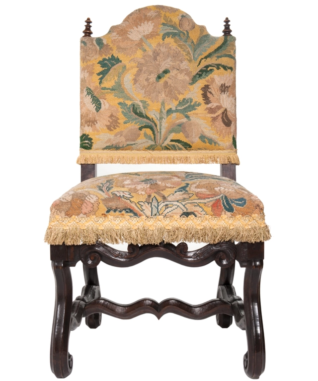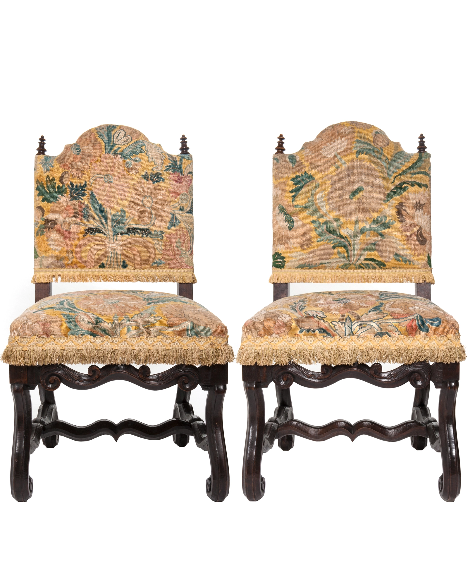 A good pair of chestnut chairs with slightly slanted backrest with arched crest rail 'chapeau de gendarme', with turned bobbins on both corners. Padded seats. Raised on scrolled legs joint by 'H' form wavy stretchers called 'os de mouton' and raised front stretcher. The chairs are upholstered in fine woll tapestry with large foliate motifs. The backrest and seat are finished with fringes. The wood has a nice patina.