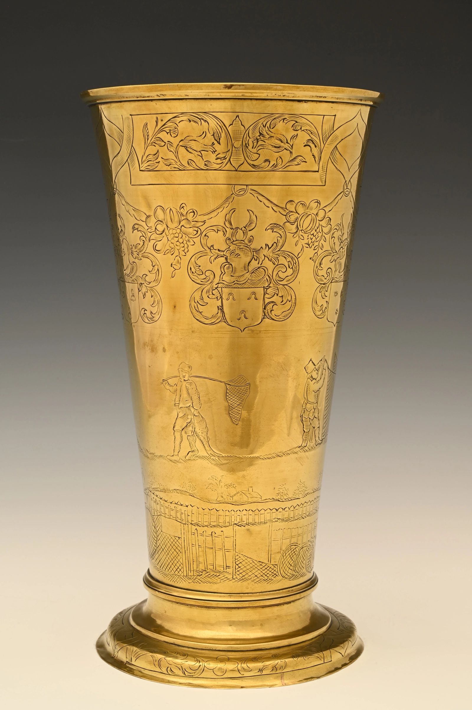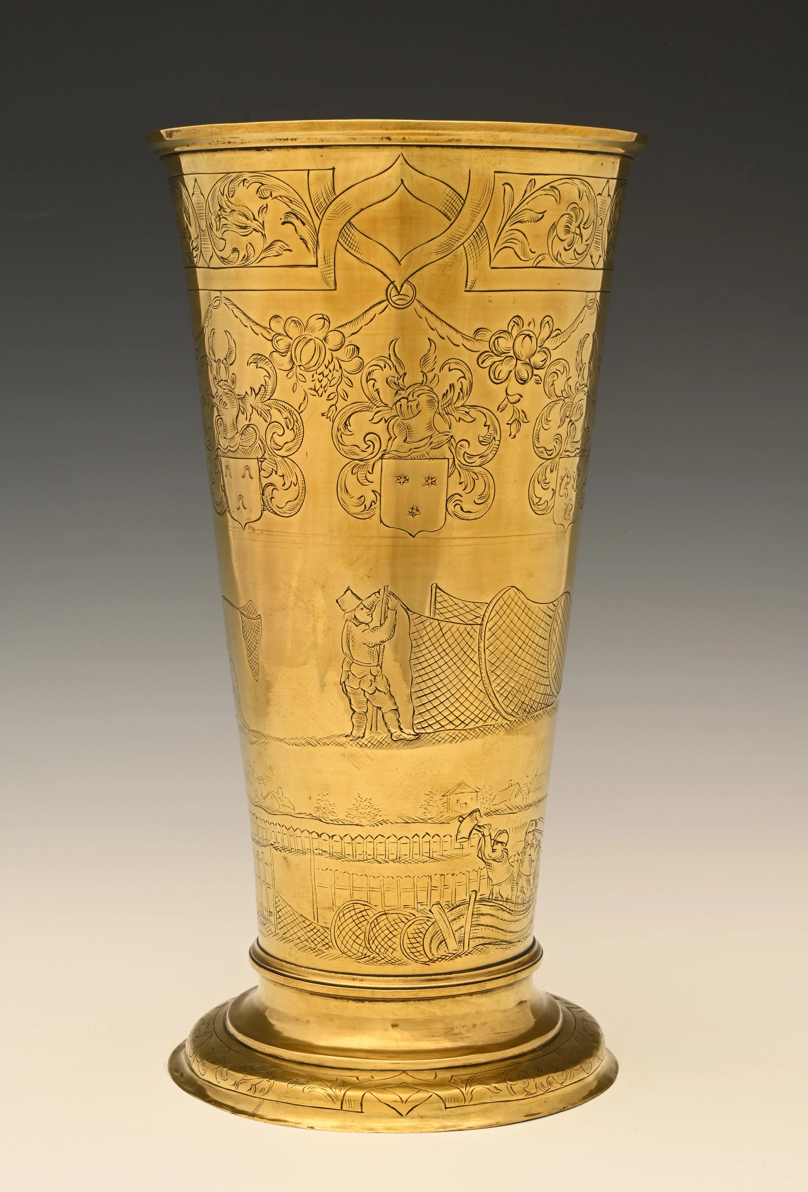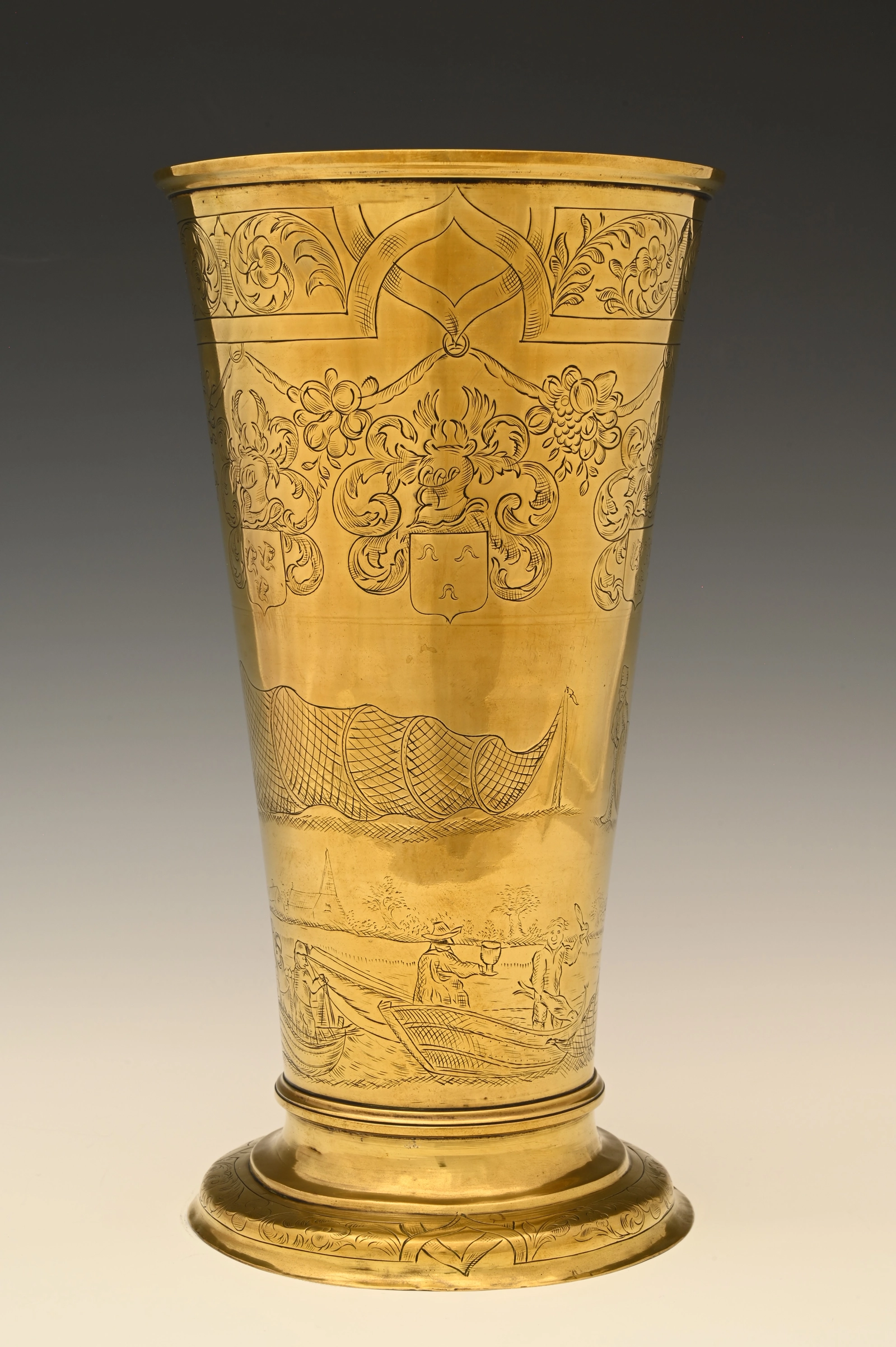 Fully engraved with reference to fishing and six family coats of arms.