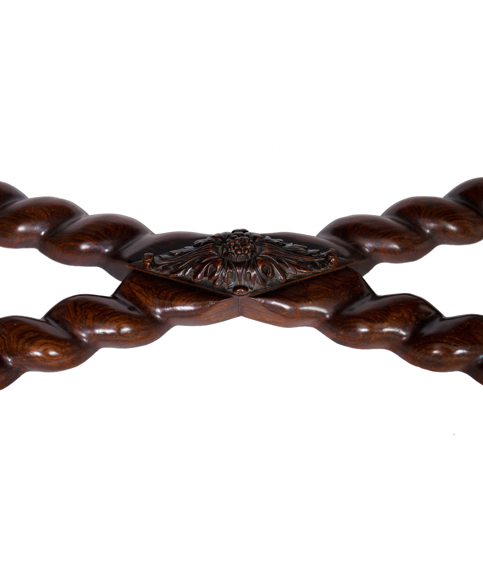 The table like stand also with two ebonized panels mounted by two carved tiny ornaments showing cherub heads with truncated wings or demons with bat-like characteristics. On four spirally-turned legs joined by twist-turned X. shaped stretchers centered by a carved rhombic rosette.