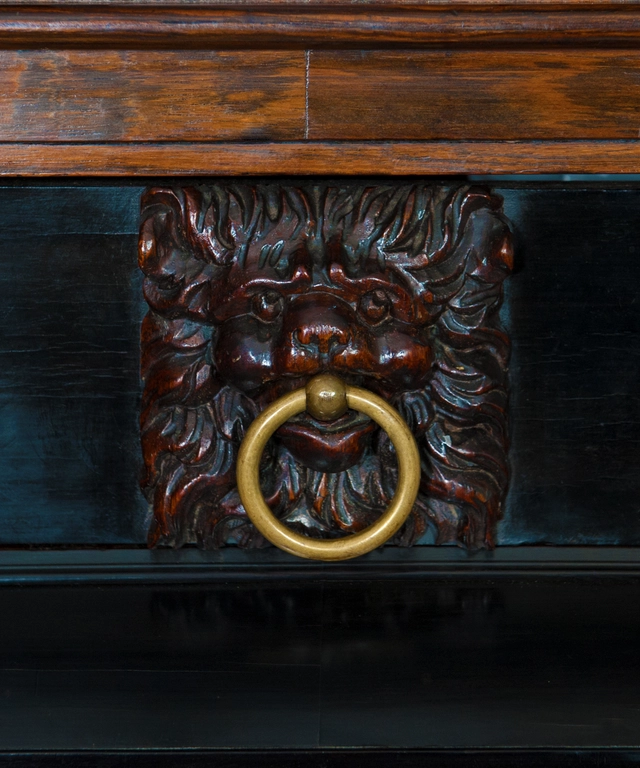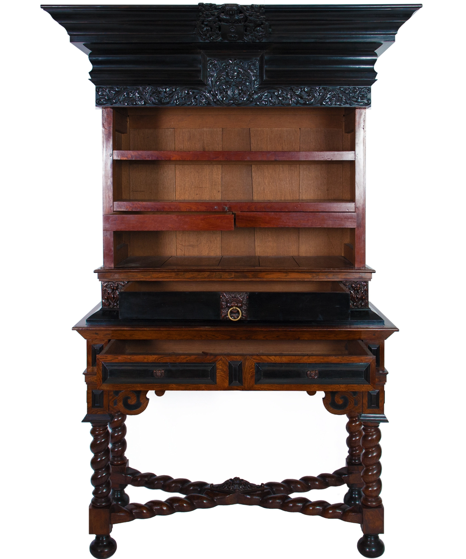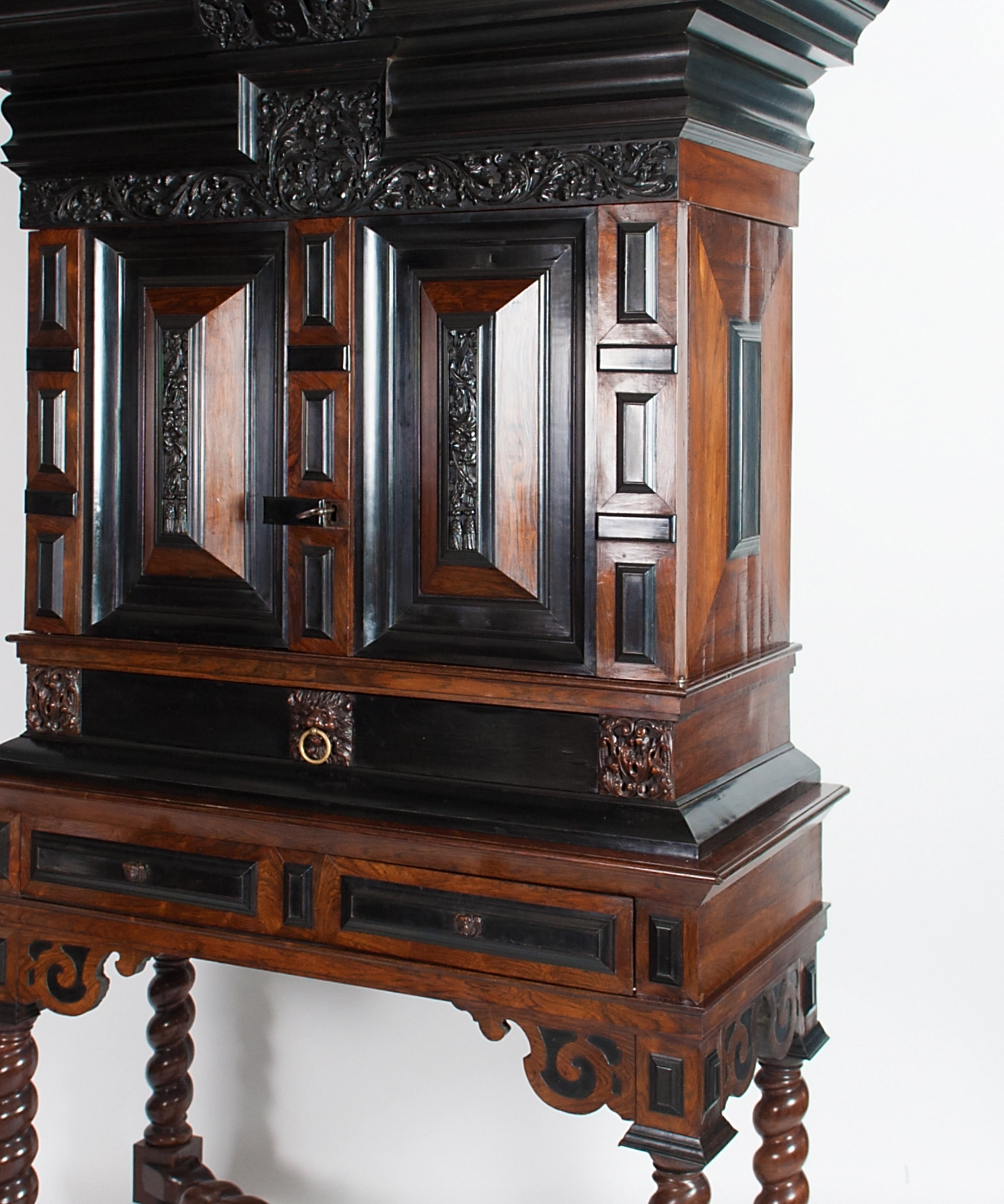 Below , two raised vertical friezes on either door in the same style including berries terminating with tassels. Under the doors an ebonized drawer with carved rosewood elements, central a ringed lion`s head drawer pull, and on both sides two auricular or mannerist style ornaments.