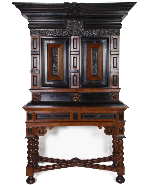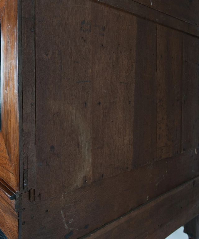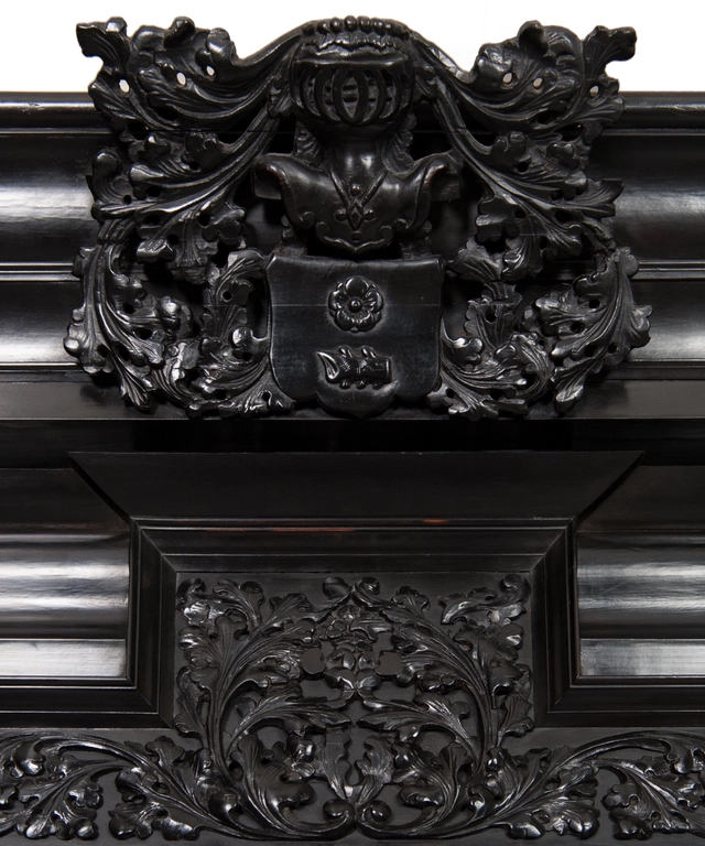 The façade decor, extremely geometric in arrangement is executed in the strict architectural format typically for the Dutch furniture of the XVIIth. Century. Surmounted by a straight entablature, with characteristic frieze, architrave, and projecting cornice. Uppermost central in the entablature is a richly carved ebony Coat of Arms (suggested for the Tjassen Family of Friesland) covered by a crowned baronet helmet, flanked by acanthus tendrils.