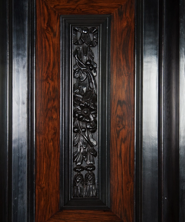 The ebony central part and frieze above the doors are also masterfully carved with meandering tendrils and stems, strongly reflecting the carving techniques and motifs employed by Colonial craftsmen used by the V.O.C. originating from Batavia, Coromandel Coast and Sri Lanka.