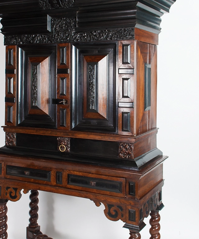 This elegant and rich Cabinet-on-Stand, typically for the second half of the XVIIth. Century, was designed in oak and enriched with carved ebony and veneers of rosewood and ebony.