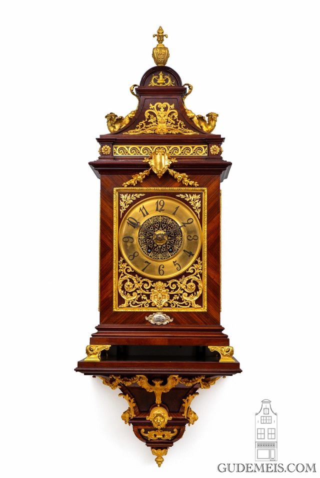 The kingswood case has a concave sided cresting with an arched moulded top surmounted by an gilt bronze ornamental urn. On the sides of the cresting there are well cast and chiseled gilt griffins and a foliate ornament to the front. Below the gilt bronze mounted freeze there is a cartouche with trailing garlands. Centrally below the chapter ring is another cartouche signed Planchon Palais Royal. The sides have rectangular panels with red fabric. The heavy moulded plinth is placed on beautifully shaped feet. The clock is placed on a matching wall bracket emphasizing the grandeur. The crisp cast gilt bronze mounts are of the highest quality and are testament of the attention to detail to which this clock was made.