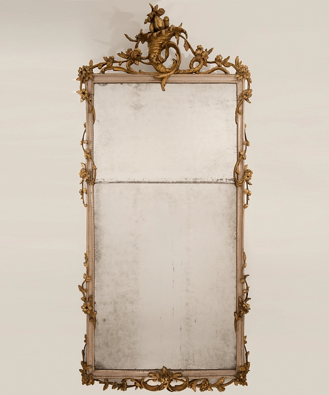 The rectangular pink lackered frame is richly decorated with gilded carving. The list is crowned by the cornucopia from which flowers and leaves are swinging around the list down to the bottom where the both sides meet in a full blown flower with leaves. The angles are formed by a flower bud. The mercury silver mirror is two-piece.